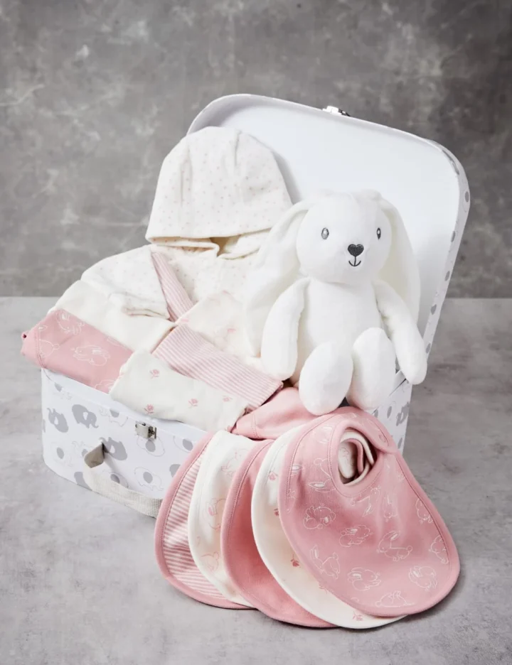 This 14-piece baby gift set is perfect for welcoming a little one into the world. Includes seven pure cotton bodysuits in a mixture of stripes and prints, five pure cotton bibs, a cuddly bunny toy and a cotton-rich knitted jacket complete with a hood. Bodysuits, bibs and the jacket feature easy popper fastenings. Comes in a reusable decorative box that’s perfect for storing keepsakes or toys. We only ever use responsibly sourced cotton for our clothes.