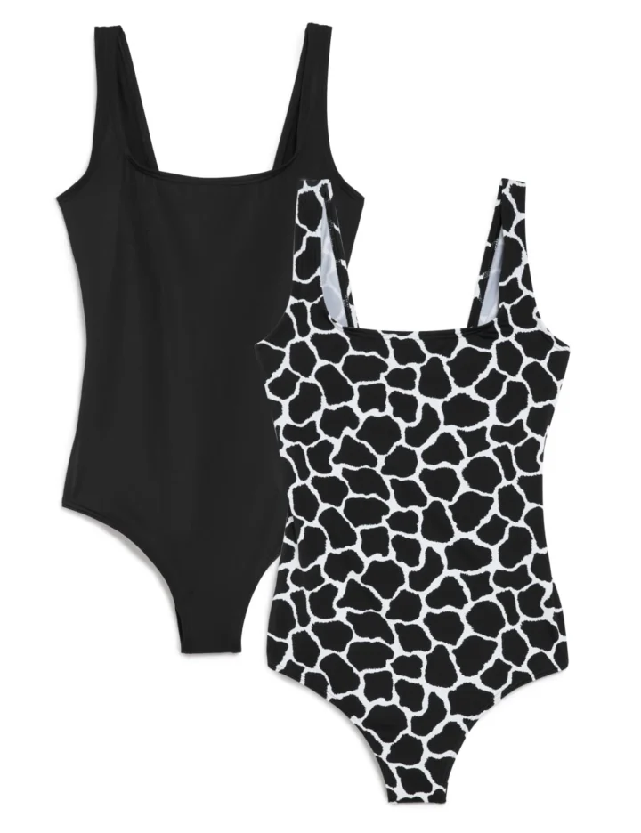 Make double the splash with this pack of two swimsuits. These plain and animal print styles are cut in a flattering regular fit, with a classic scoop neck and non-padded, non-wired cups. Added stretch ensures all-day comfort, and our clever StayNew™ chlorine-resistant fabric holds its shape for no sagging or bagging.