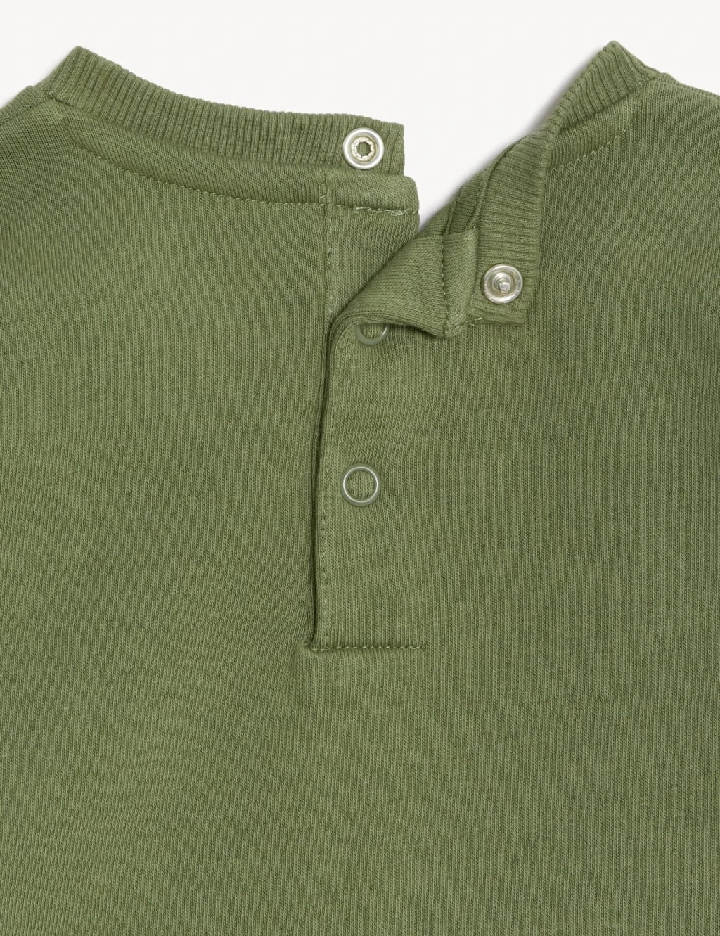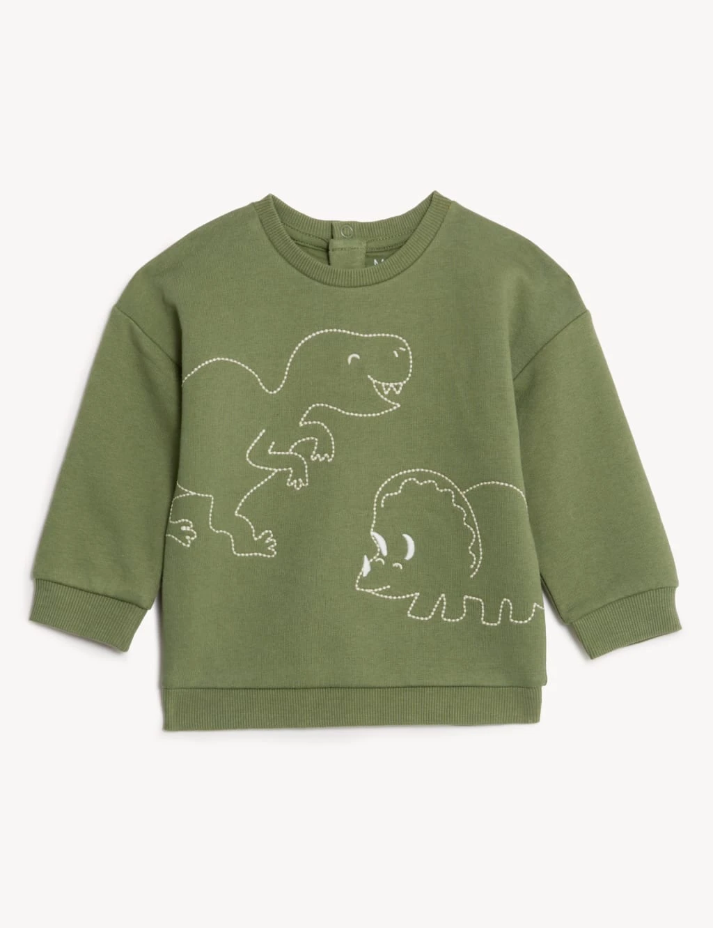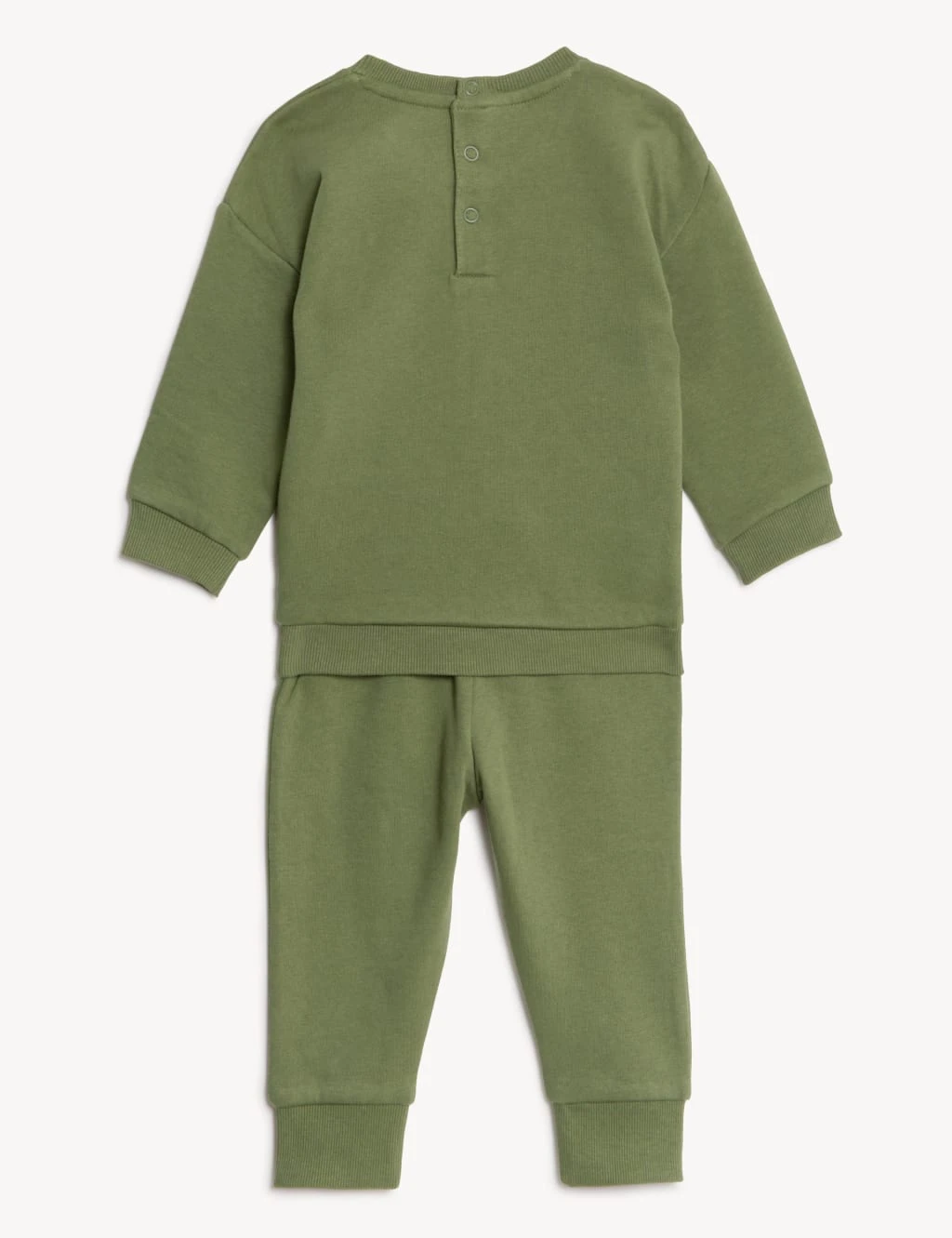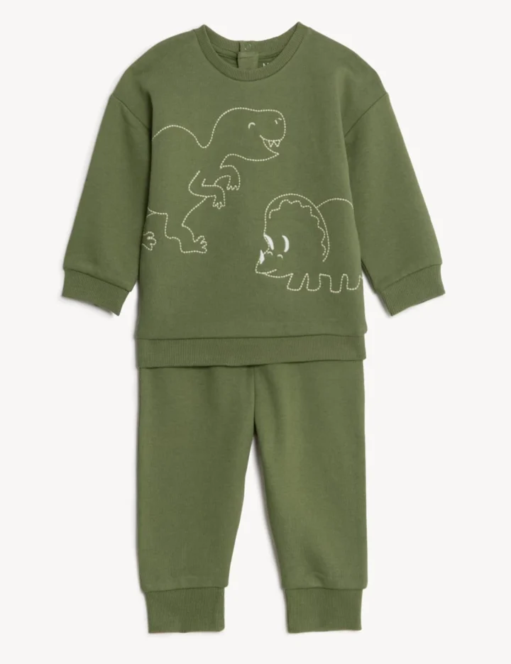 Keep them comfy as they explore with this two-piece cotton-rich outfit. The cosy sweatshirt has a handy popper fastening on the back and an embroidered dinosaur design. Pull-on jogging bottoms feature a drawstring fastening and playful stegosaurus spikes on the side.