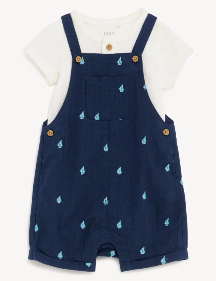 Tiny embroidered boats sail across this charming cotton-rich outfit. A touch of linen lends an extra breathable quality to the sweet bibshorts which feature handy adjustable straps, a patch pocket and contrast buttons. The short-sleeved bodysuit has buttons to match. Both pieces have popper fastenings at the gusset for quick changing.