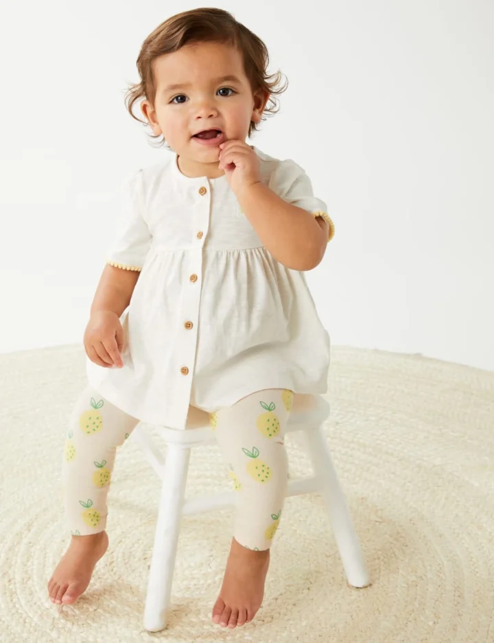 They’ll look extra sweet in this cotton-rich jersey outfit, perfect for warm-weather days. The two-piece set includes a fit-and-flare t-shirt with a front button fastening and a pretty scalloped trim on the sleeves. Paired with co-ordinating leggings featuring a cute lemon print.