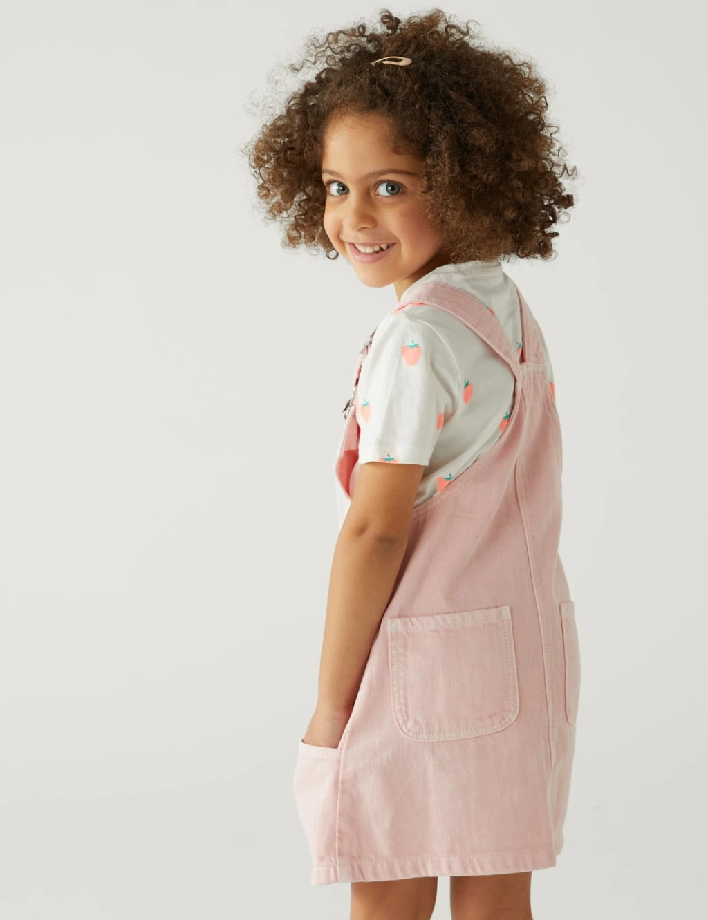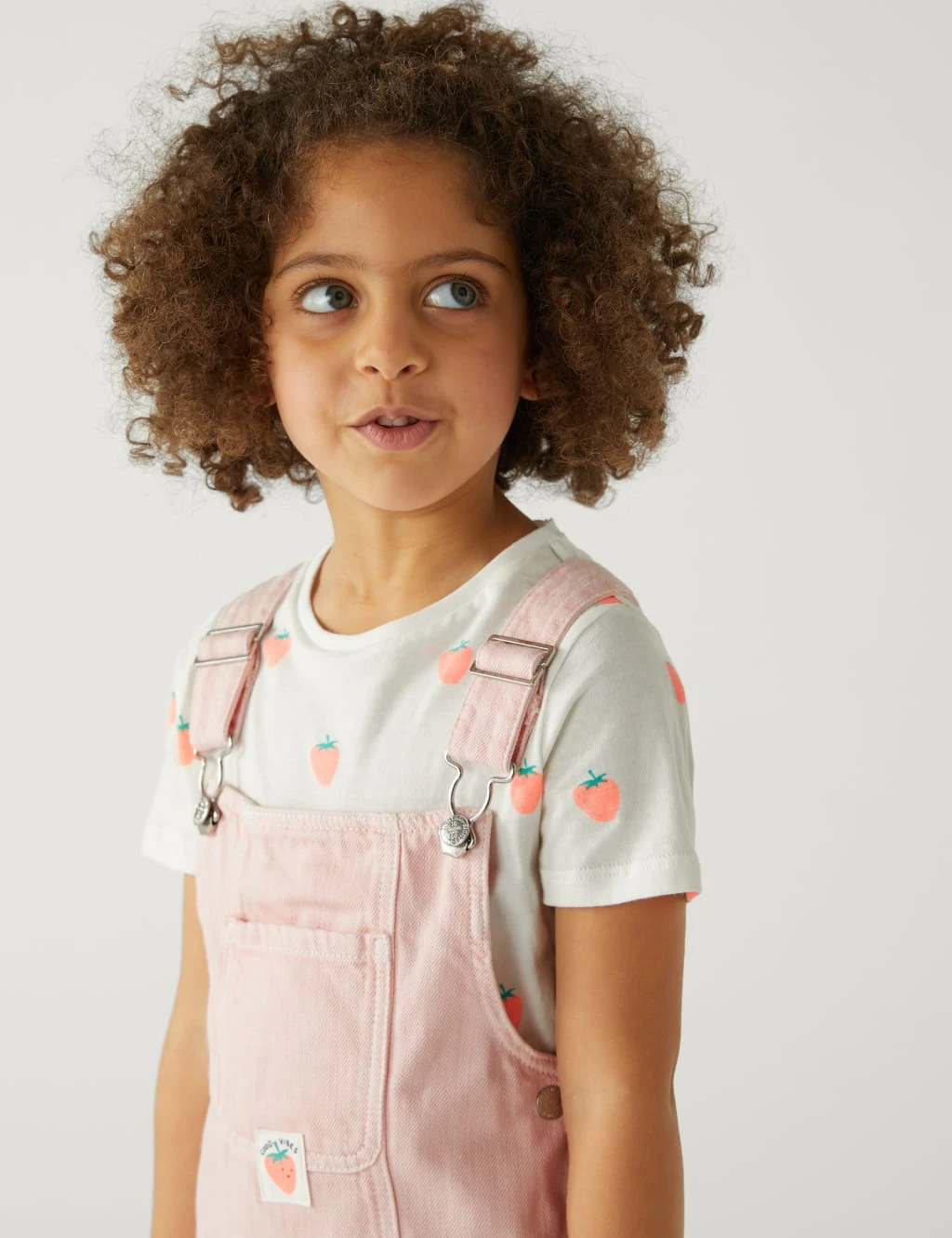 Get them ready for the weekend in this two-piece outfit. Set includes a pure cotton t-shirt and a cotton-rich pinafore dress, both in a regular fit. The t-shirt is printed with strawberries and the pinafore fastens with adjustable clasps and buttons on the side. Three handy pockets and a ‘Good Vibes’ slogan patch complete the piece.