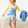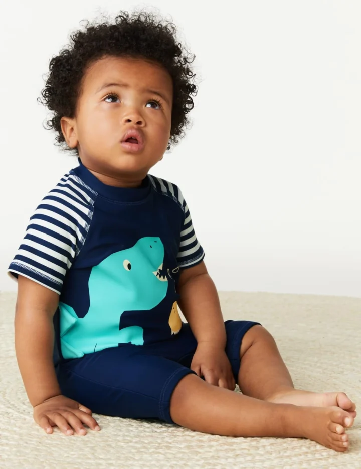 Bring out their inner roar with this adorable dinosaur swim outfit. Set comprises a swimsuit with striped arms and a dinosaur graphic on the front and a cute striped hat with dinosaur horns. The ‘Roarsome’ slogan adds a playful touch. Crafted from Sun Smart fabric, endorsed by the British Skin Foundation, to protect against UV rays. A chlorine-resistant finish ensures long-lasting wear.