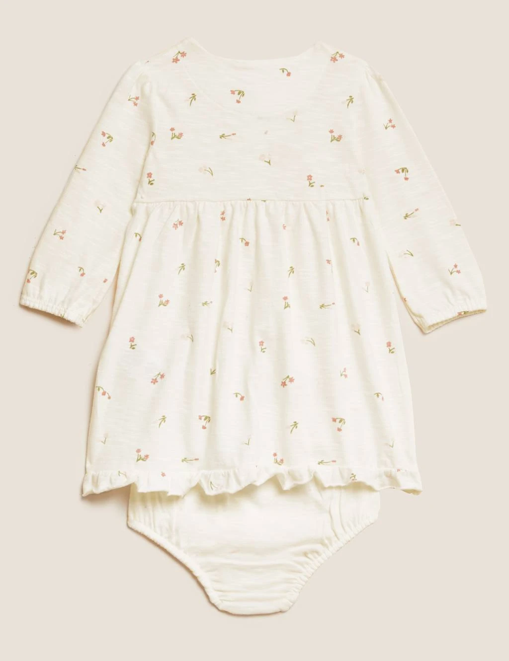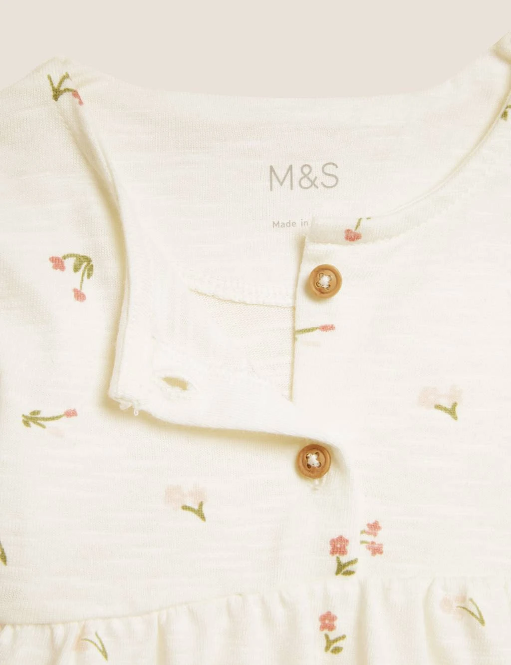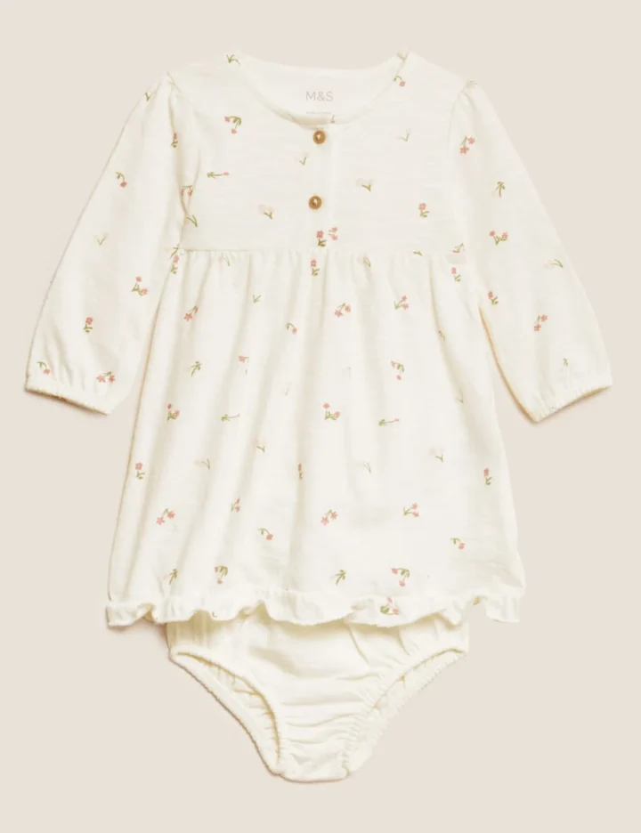 Get baby ready in an instant with this sweet pure-cotton, two-piece set. It includes a floral-print dress with mock-wood button fastenings, soft gathers at the waist and a sweet frilled hem. Pair with the plain knickers, designed with an elasticated waist for a comfy fit. We only ever use responsibly sourced cotton for our clothes.