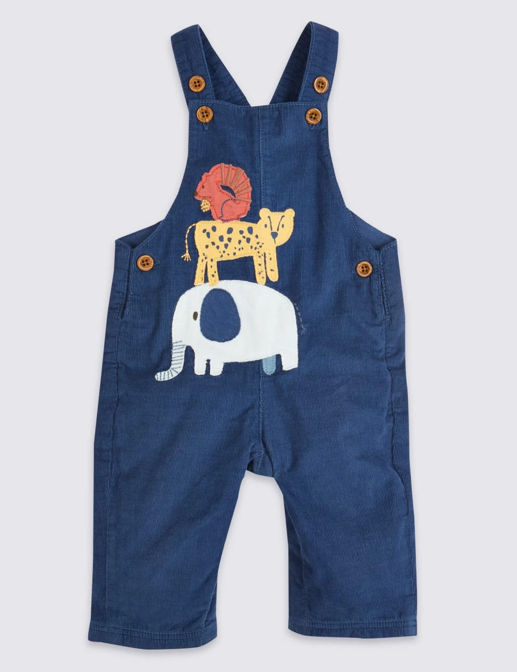 Punchy stripes and adorable animal characters make this outfit a fun playtime choice. Crafted from responsibly sourced cotton. Long-sleeved bodysuit fastens with poppers for fuss-free nappy changing. Corduroy dungarees with animal appliqué and button fastenings. All of the cotton for our clothing is responsibly sourced and always will be.