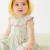 This adorable pure cotton outfit is decorated with a pretty floral print. The tiered dress has short sleeves and fastens with a neat row of buttons at the front. A matching hat with a sweet ruffled trim completes the set.
