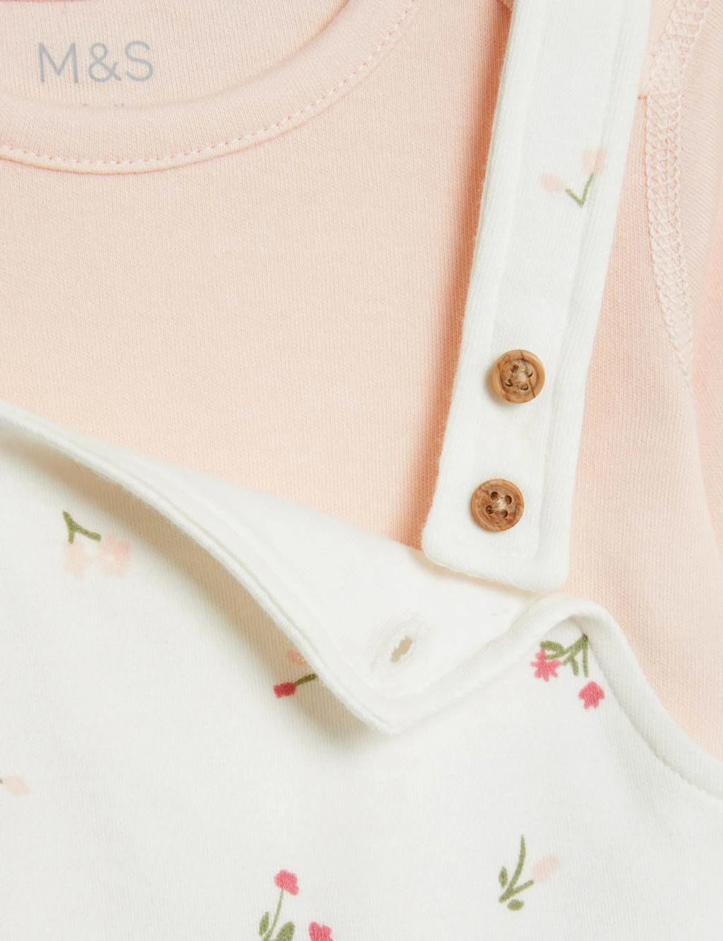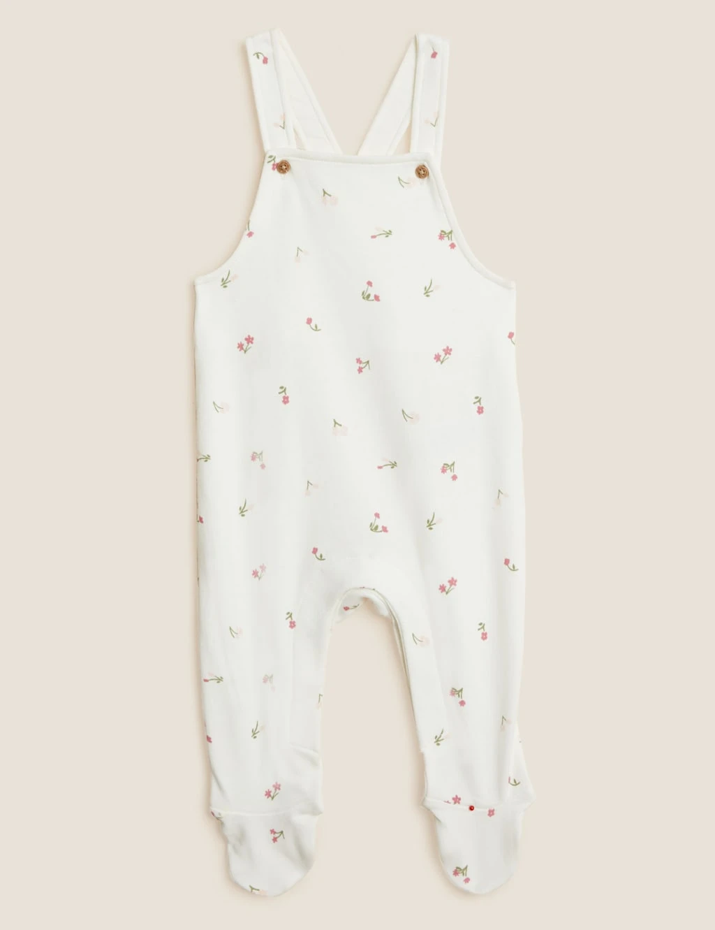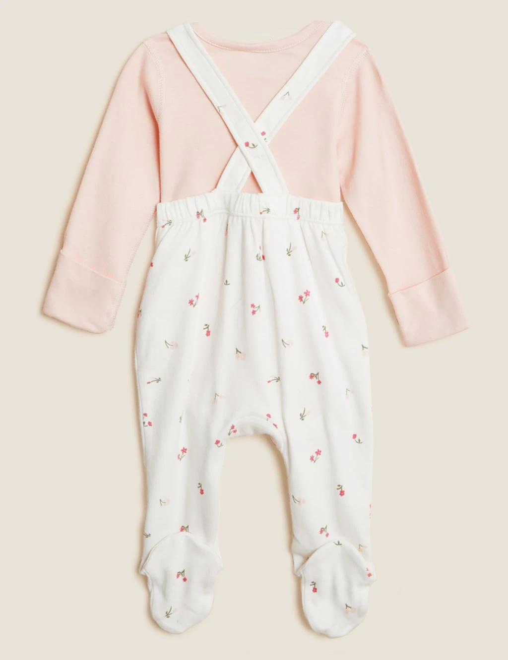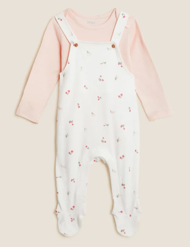 Crafted from soft cotton, this cute outfit will keep them extra cosy. Two-piece set includes a long-sleeved bodysuit and a pair of adorable floral dungarees. Envelope neck and popper fastenings for easy on-off. Features integral mitts to prevent scratches for up to six months and Babysafe toes for comfort and safety. Flat seams feel gentle against the delicate skin. Finished with classic mock wood buttons. We only ever use responsibly sourced cotton for our clothes.