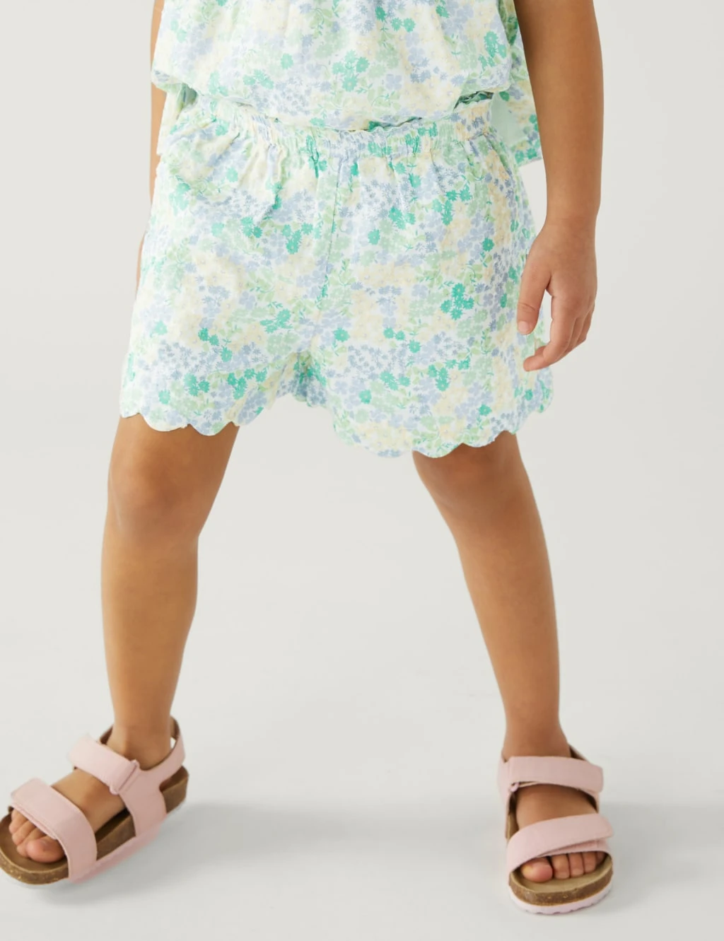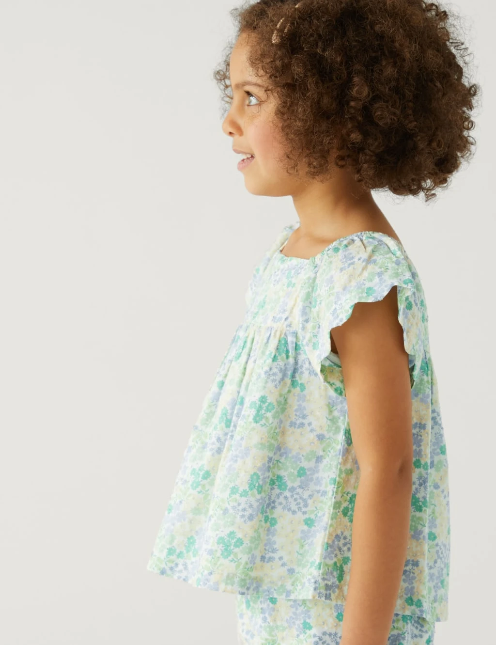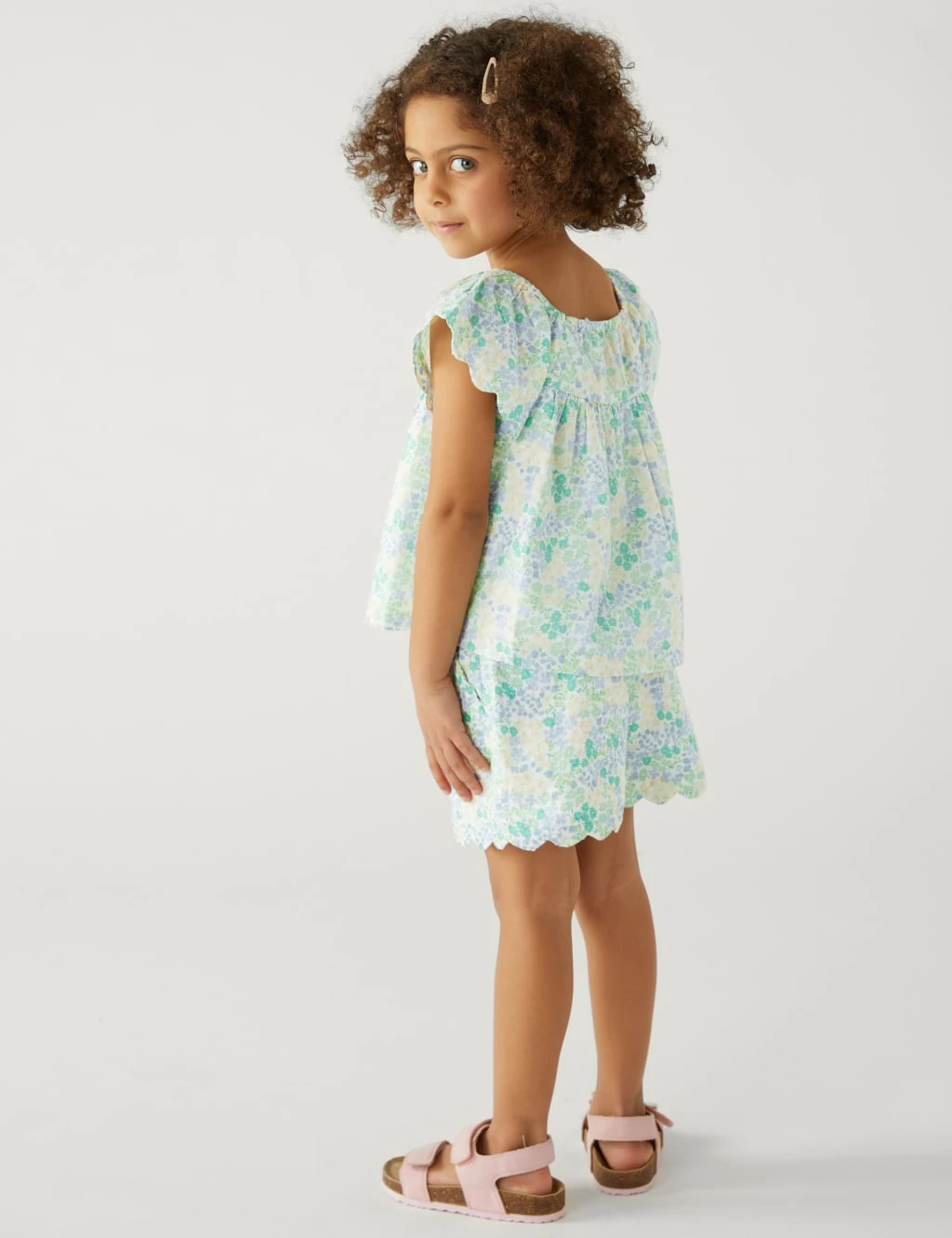 This pure cotton outfit blooms with pretty pastel florals. Comfy regular fit. Comprises a breezy peplum top and shorts with a flexible elasticated waist. Scallop trims and frilled sleeves add a sweet touch.