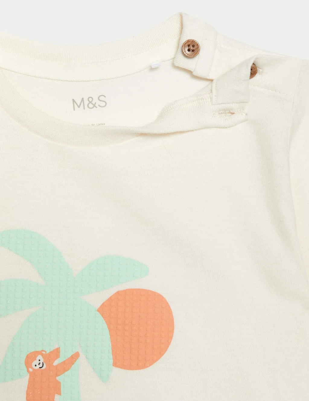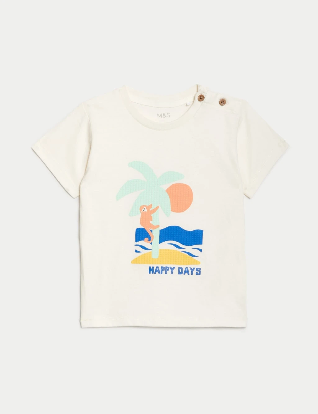 Get them in the holiday spirit with this sweet pure cotton outfit. The round-neck t-shirt fastens with buttons at the shoulder, while the pull-on shorts have a drawstring at the elasticated waistband for a comfy fit. A palm tree print and ‘Happy Days’ slogan on the t-shirt provide a playful finish.