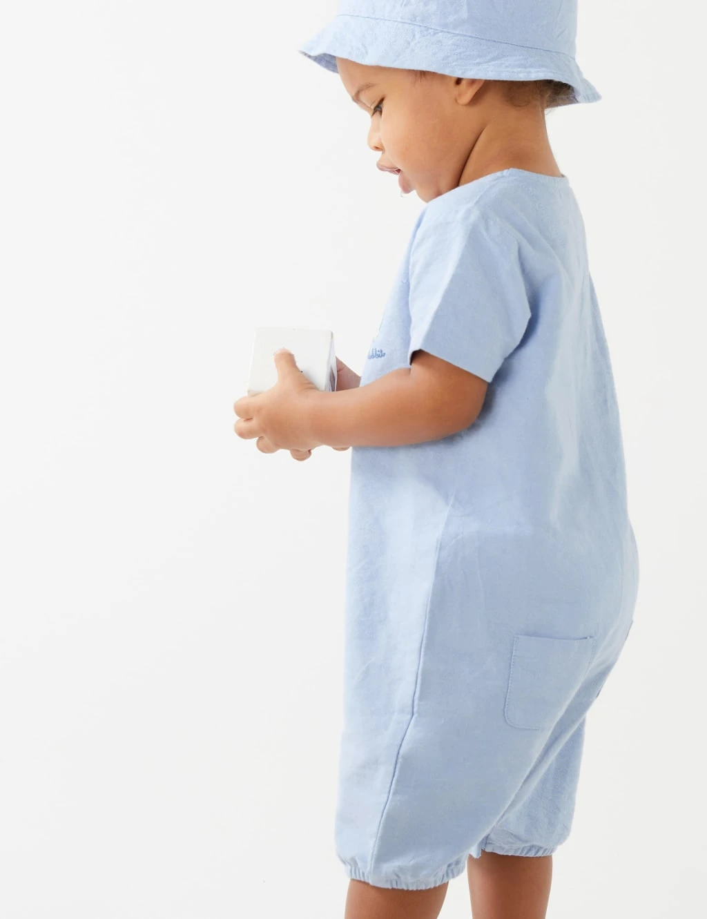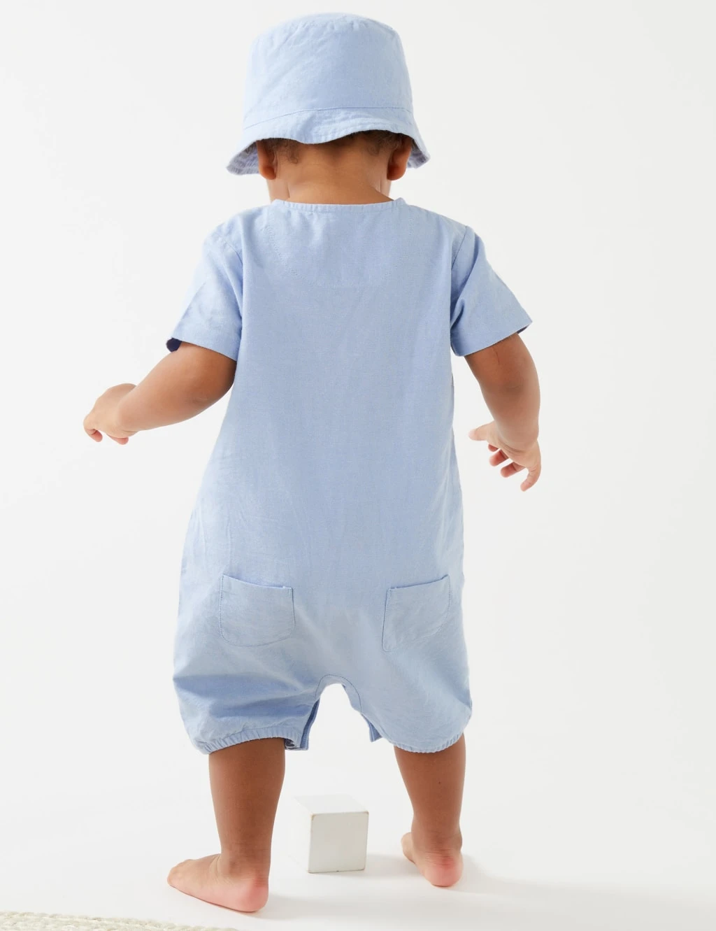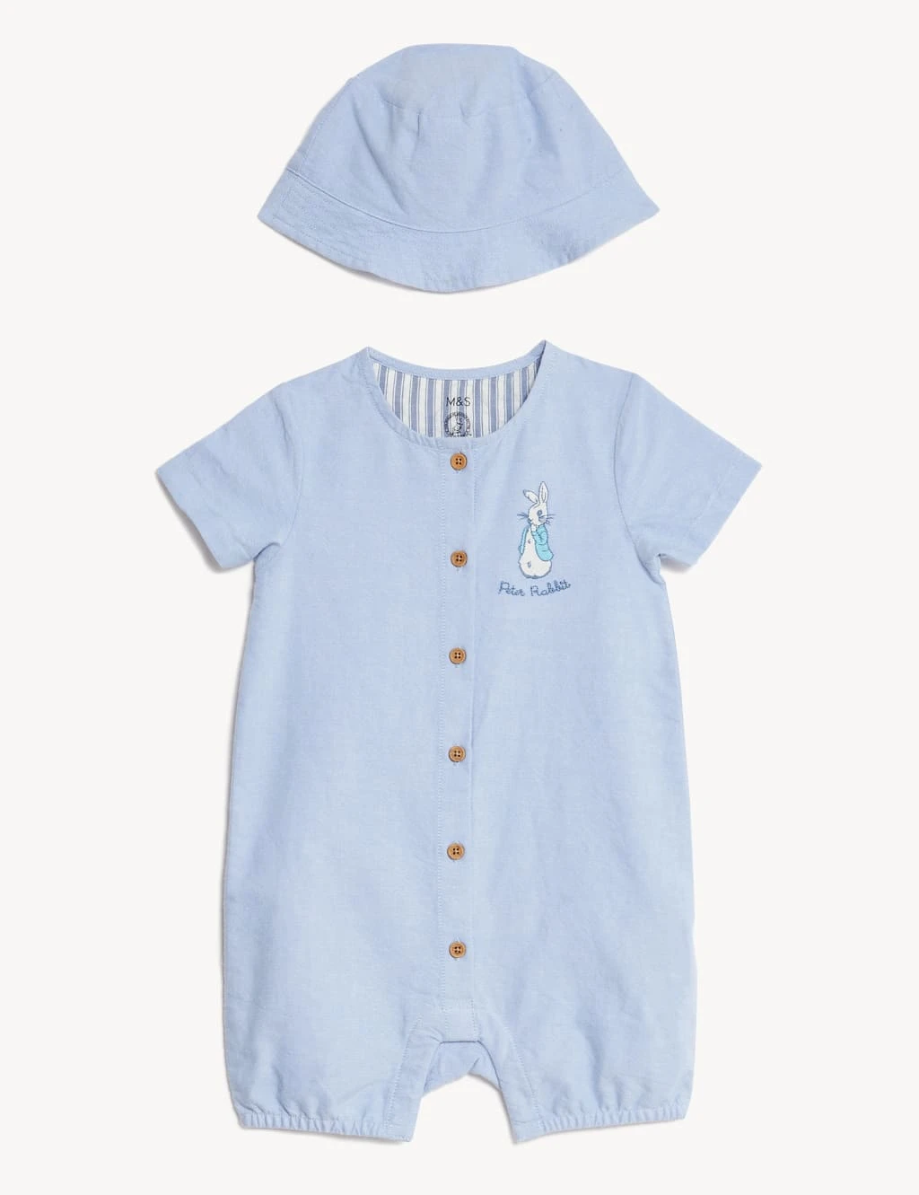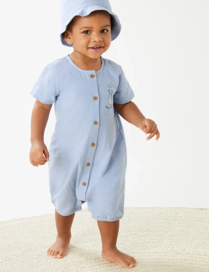 Dress your little one in the classic charm of this pure cotton outfit, featuring Peter Rabbit™ embroidery. Two-piece set includes a short-sleeved chambray romper with buttons through the front and poppers at the legs for easy changing. Comes complete with a matching hat.