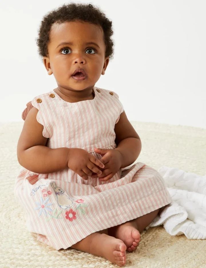 This pure cotton Peter Rabbit™ outfit is perfect for warm-weather dressing. Includes a striped dress and matching knickers. Button fastenings on the shoulder make for easy dressing, while an elasticated waist and legs ensure a comfy fit. The sleeveless dress features pretty scalloped detailing and a charming embroidered motif.