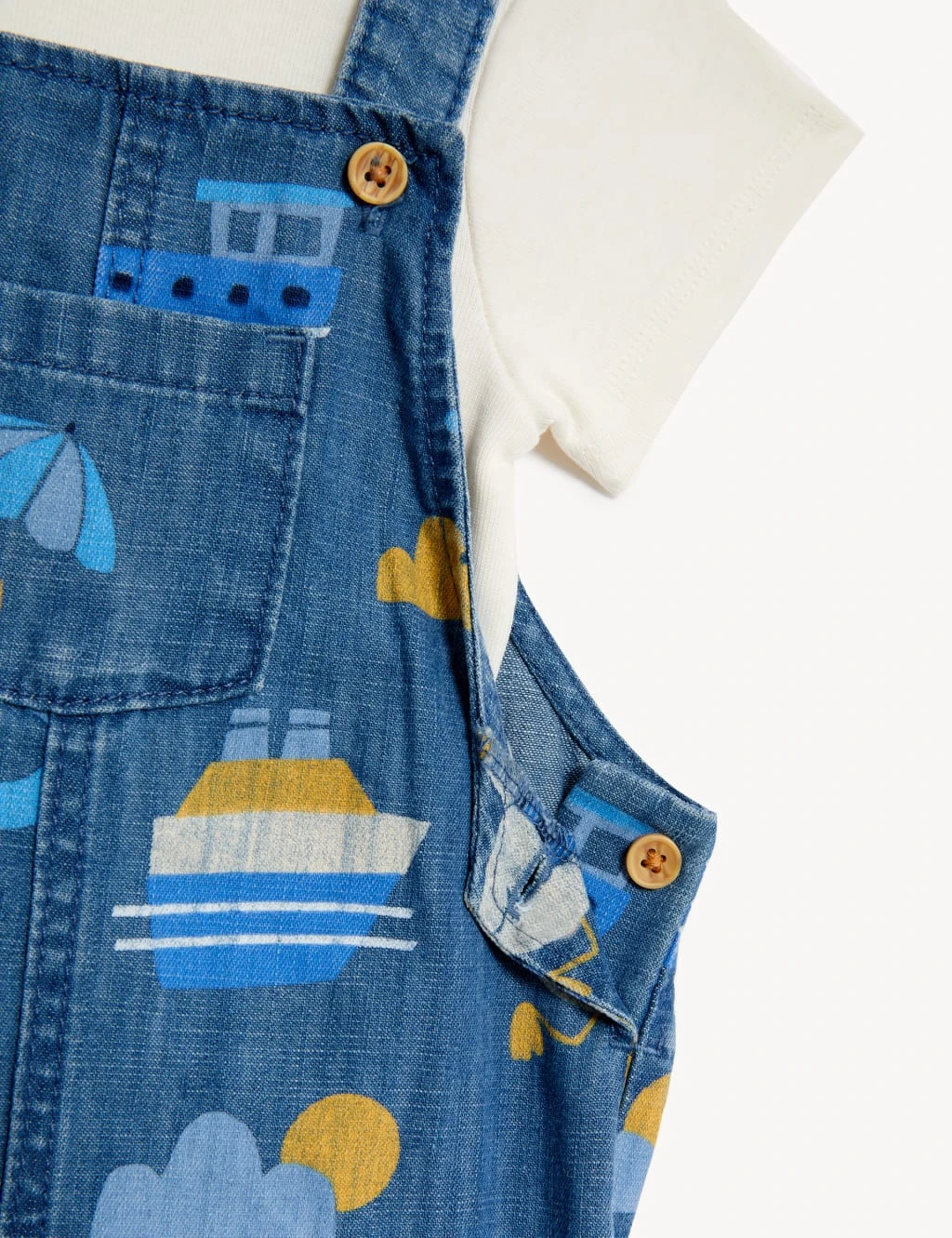 With its graphics of fishing boats and cheeky gulls, this pure cotton bibshort set is just the thing for a day at the seaside. The bibshort is made from printed denim with poppers for easy changing. Short-sleeved bodysuit also has poppers to make nappy changing easy.