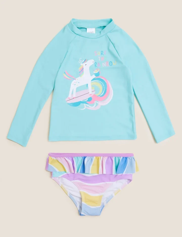 With its cute unicorn and rainbow print, this rash vest set is as fun as it is functional. Comfy regular fit, with added stretch for comfort. Long sleeves to keep little arms covered. Made from Sun Smart fabric for extra protection against harmful UV rays. Endorsed by the British Skin Foundation and designed with a durable chlorine-resistant finish.