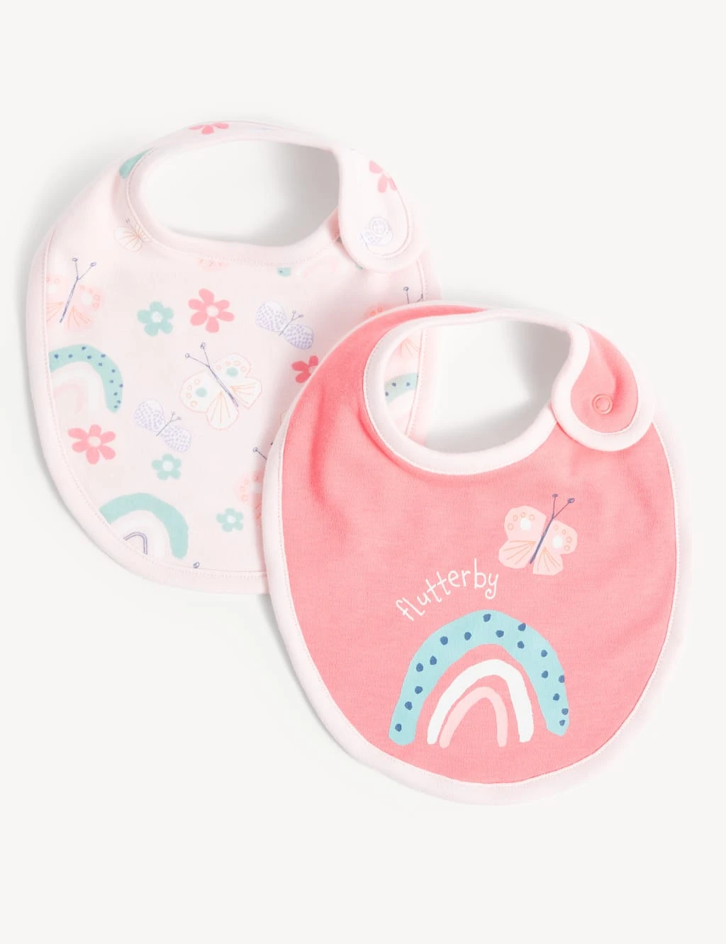 Featuring butterfly and rainbow prints, this pack of two cotton-rich bibs will add a sweet touch to your little one’s daily essentials. The towelling back helps to absorb spills, while the popper fastening allows for easy changes.