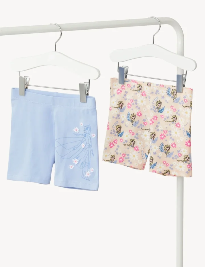 Young Disney Frozen™ fans will love this two-pack of cotton-rich cycling shorts. Comfy regular fit, with an elasticated waistband and extra stretch in the fabric. One pair features a glittery Elsa™ and embroidered daisies on the thigh, while the other is decorated with a pretty all-over print.