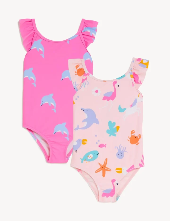 These swimsuits are ready to be by the seaside with their colourful marine animals print. Pretty frilled straps. One swimsuit with all-over dolphins, the other with a mixed sea creatures design. Our Sun Smart UPF50+ fabric helps protect them from harmful UV rays. The fabric is also chlorine-resistant for longer-lasting quality.