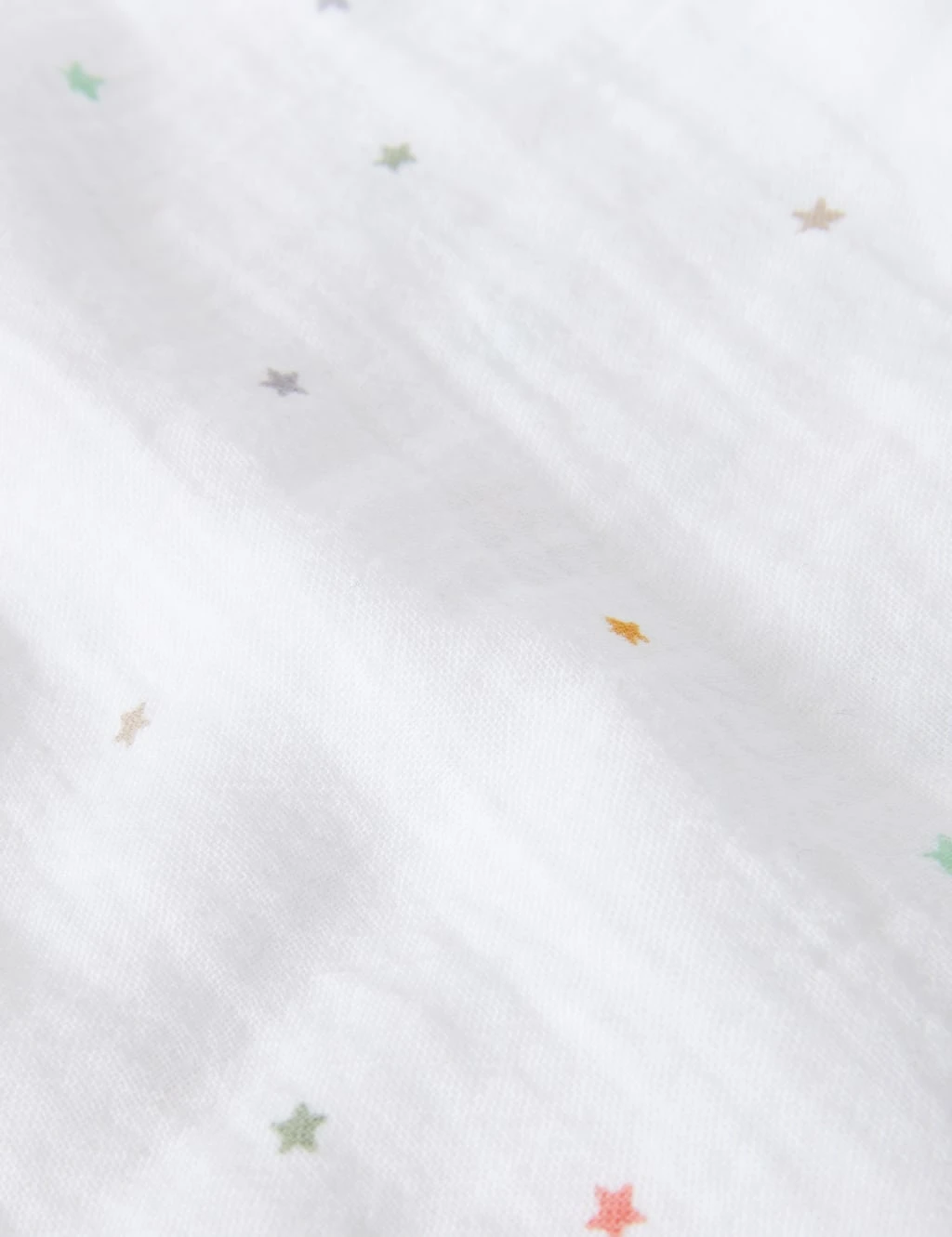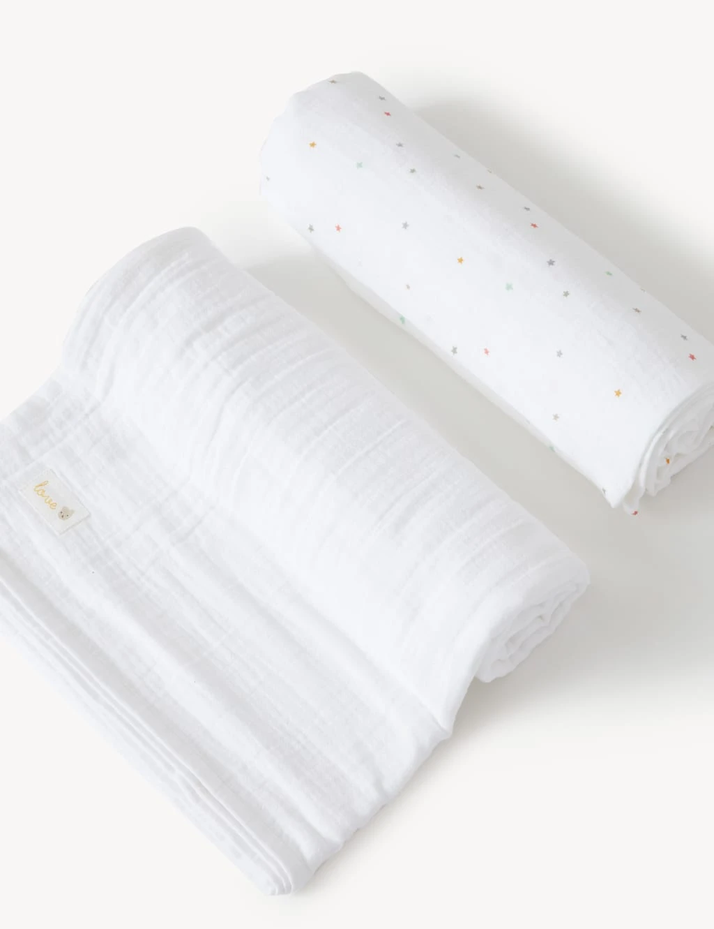 These large, pure cotton muslins are perfect as a swaddle blanket or a dribble cloth. One features all-over stars and the other has a small tab with the slogan ‘Love’. The soft, breathable material is specially woven to feel gentle on baby’s skin.