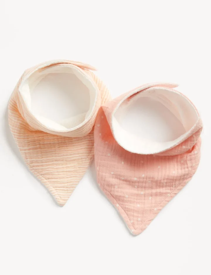 Our dribble bibs are cute as well as practical. Handy two-pack contains striped and spotted options that fasten easily at the back with poppers. The outside layer is made from pure cotton while the lining features soft cotton-rich towelling fabric.
