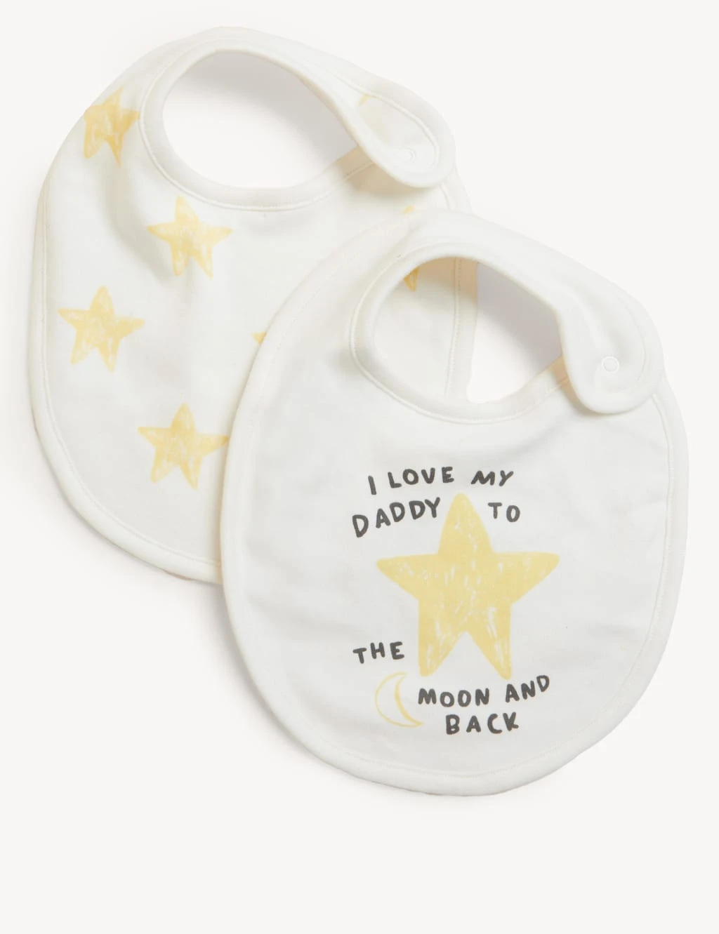 Stock up on baby essentials with this two-pack of pure cotton bibs. They’re made with soft towelling fabric and have a roundel shape. One has a star design and a cute message, while the other has an all-over starry print. Popper fastenings ensure they’re easy to get on and off. We only ever use responsibly sourced cotton for our clothes.