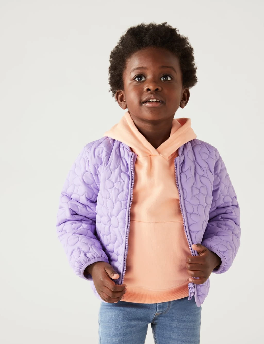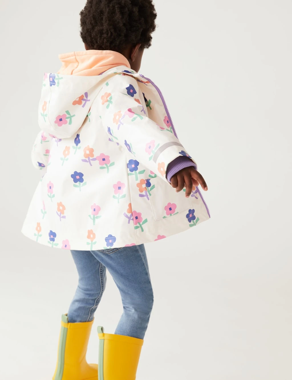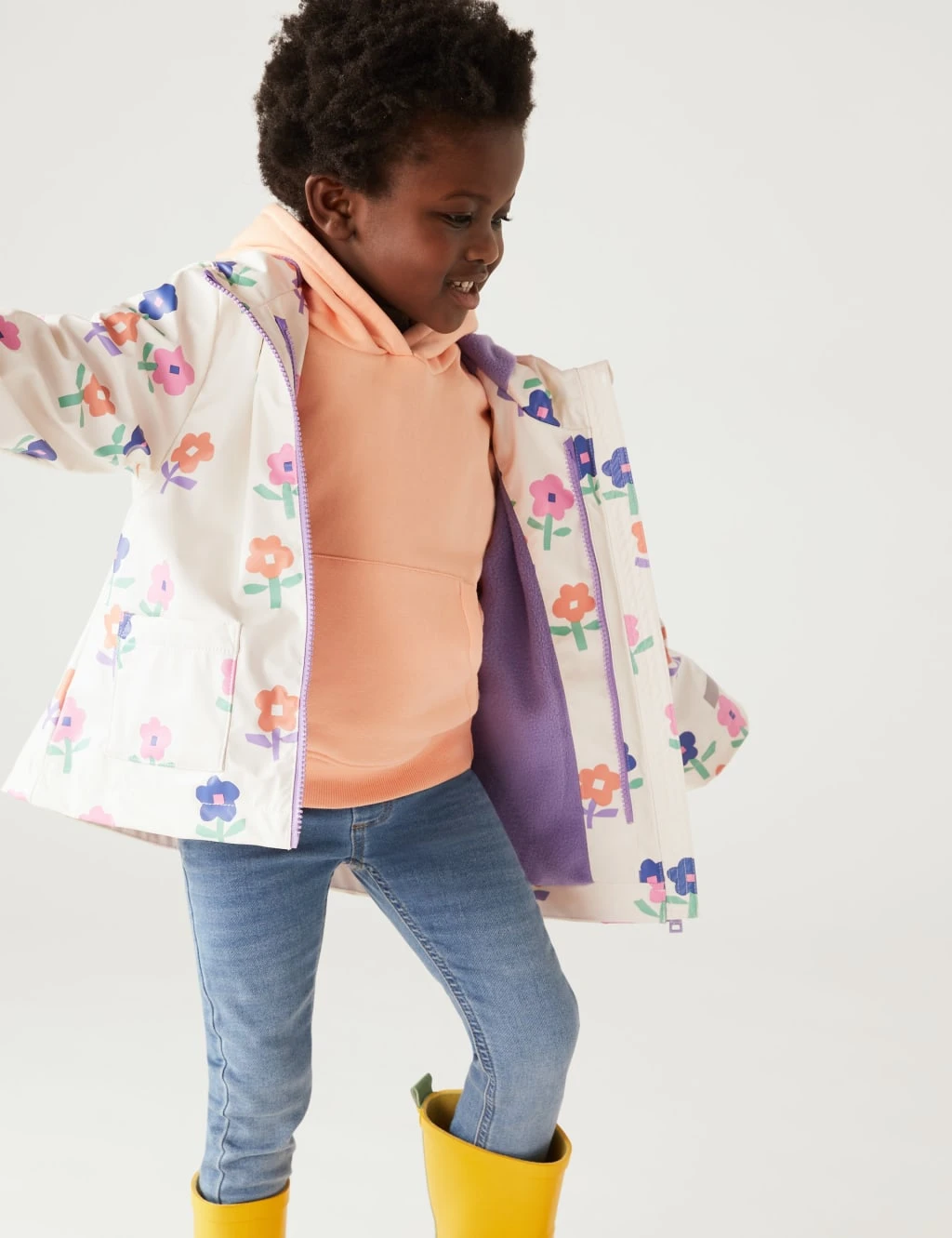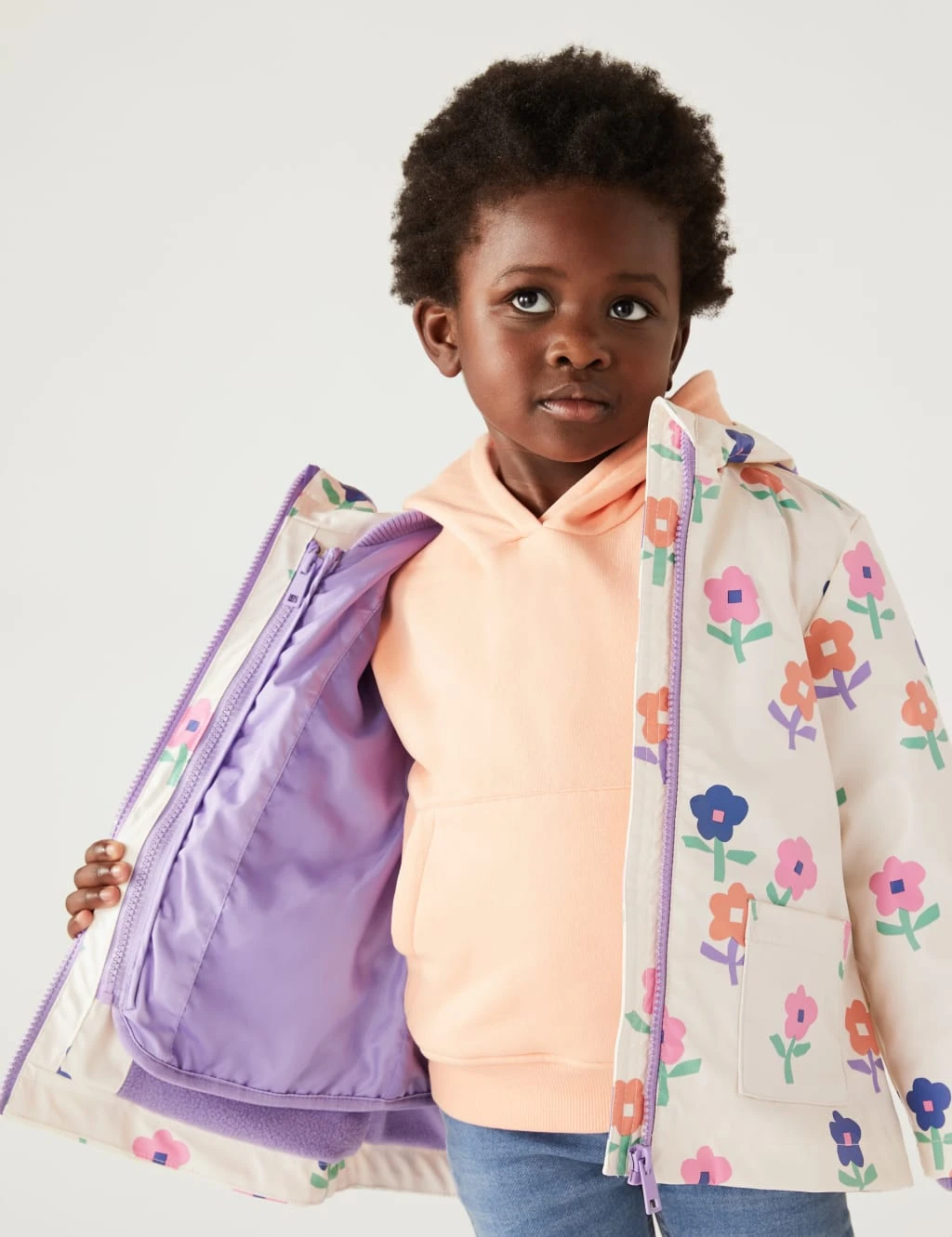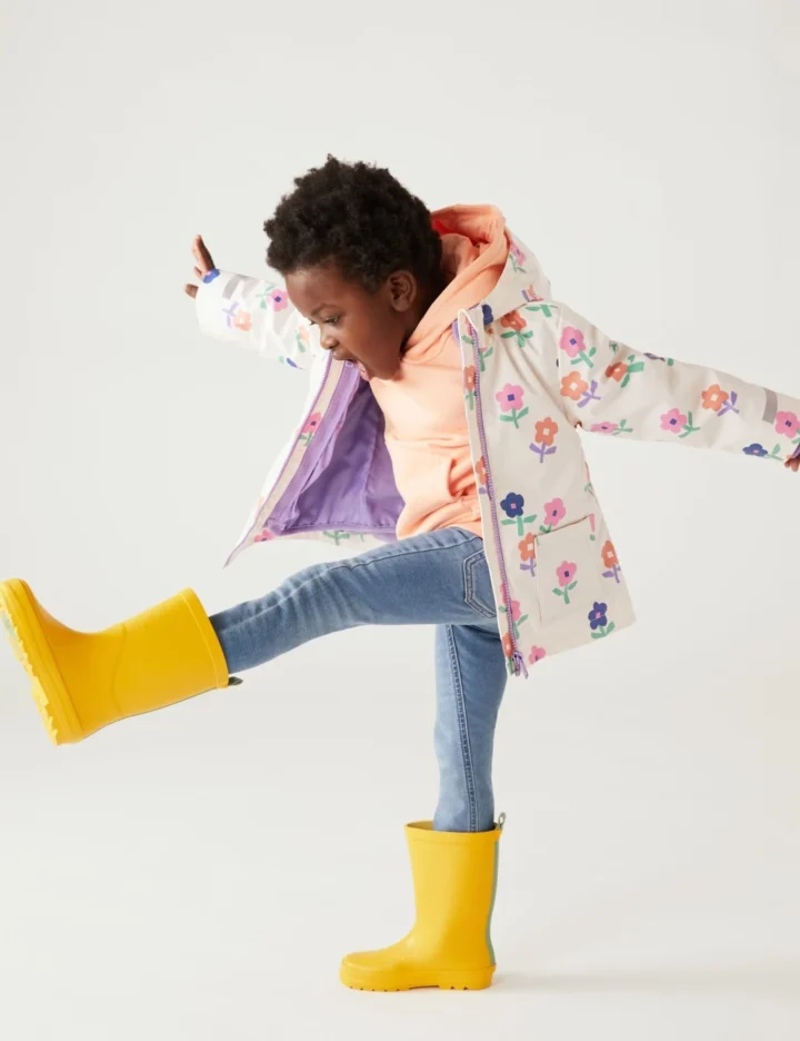 Instantly brighten up drizzly days with this vibrant floral raincoat. Comfy regular fit. Its three-in-one design includes a quilted inner coat for warmth and an outer coat finished with water-repellent Stormwear™ technology. The hooded neckline is complete with a soft fleece fabric to keep them cosy.