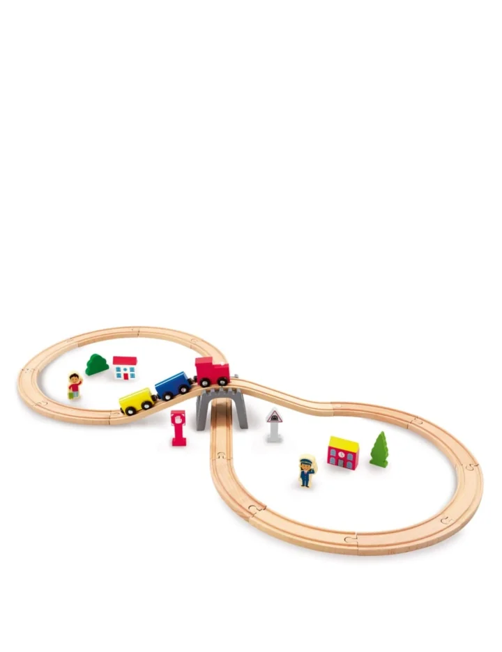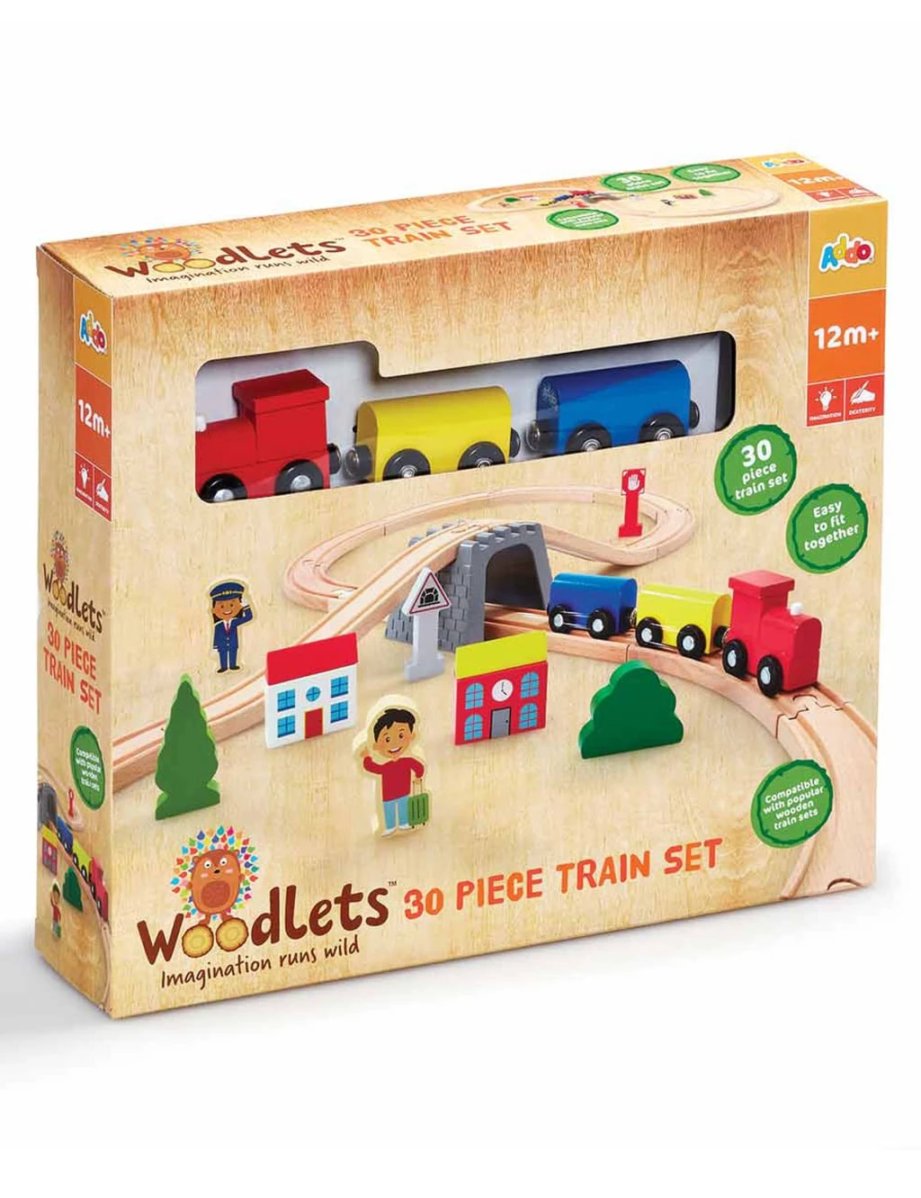 Children can build their very own railway with this 30 piece train set from Woodlets. Set includes an easy-to-build track complete with bridge, plus a magnetic three-carriage train. Set the scene with figures including signs, trees, train station and a house, plus conductor and a passenger to spark imaginative play. Each wooden piece is made for easy grip, with a range of colours to aid recognition skills. Suitable for children aged 1+ years.