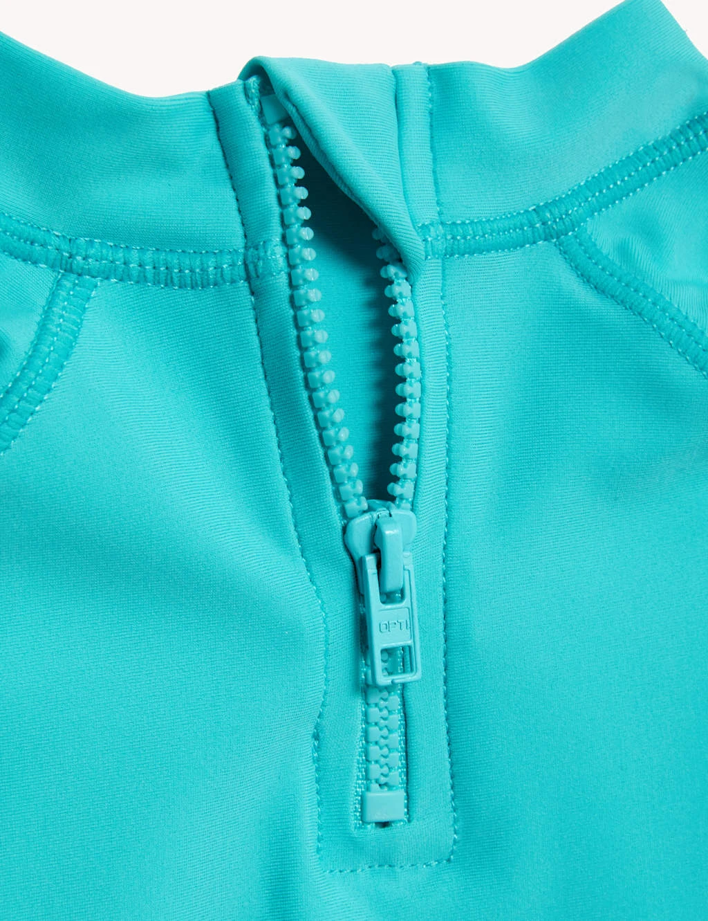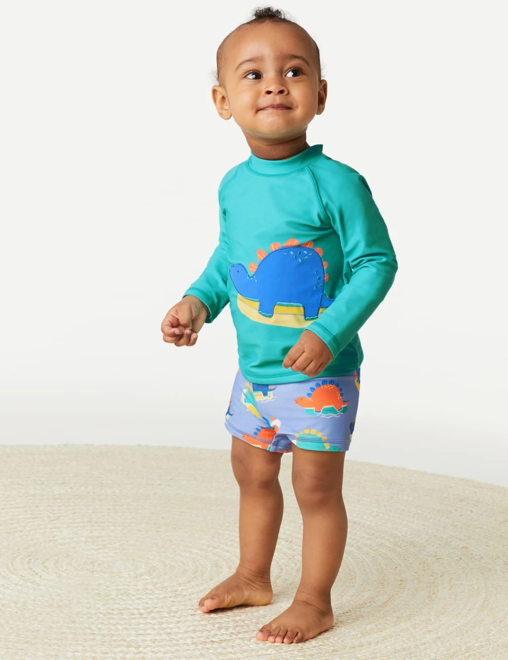 This dinosaur swim outfit is perfect for fun days out at the pool or beach. The three-piece set comprises a zip-up long-sleeved top, matching shorts and a hat to shield their face and neck. Made from durable chlorine-resistant fabric with added stretch for comfort. Our Sun Smart finish helps protect against harmful UV rays and is endorsed by the British Skin Foundation.