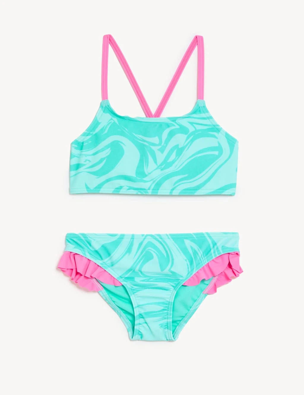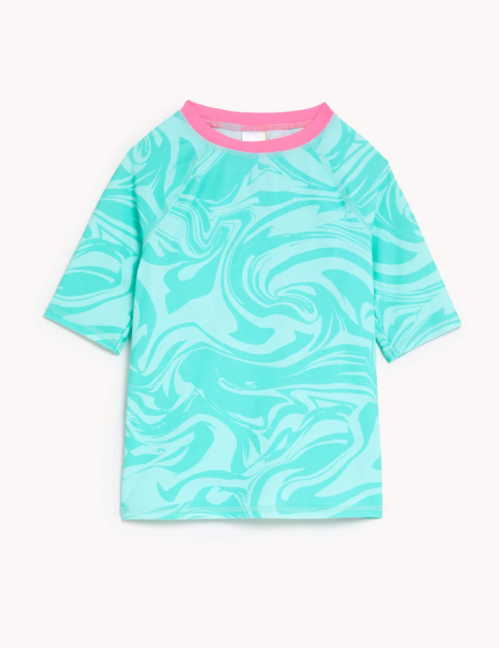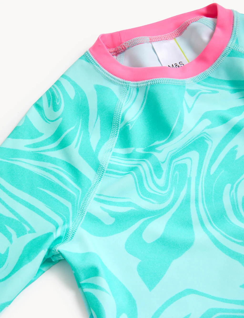 This three-piece swim set has the option of two tops for little ones who love to change their mind. Includes a short-sleeved rash vest, bikini top and matching bottoms – all with a swirly marble print. Made with chlorine-resistant technology to make it last wear after wear. Endorsed by the British Skin Foundation, the Sun Smart UPF50+ fabric helps to protect them from UV rays.