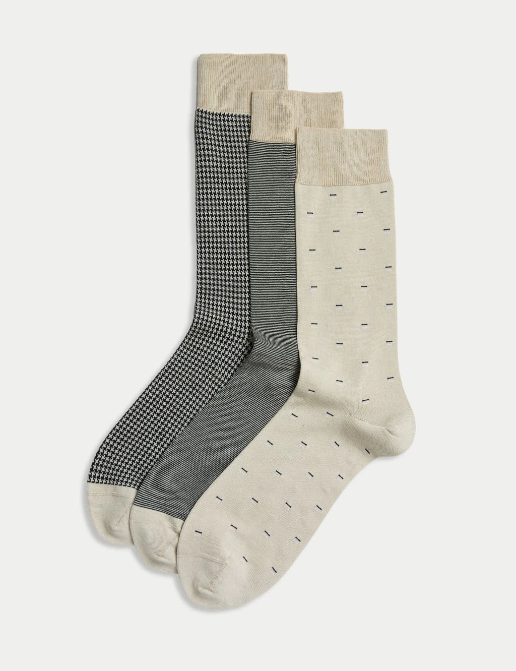 Refresh your sock drawer with these cotton-rich socks. Pack of three ribbed pairs includes striped, dogtooth and spot patterns.