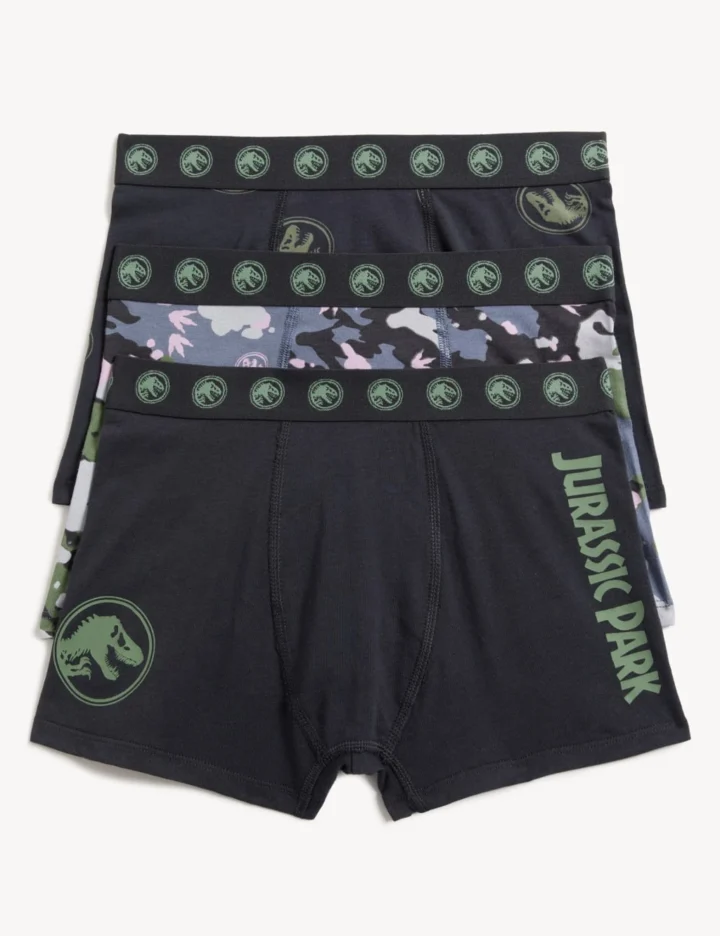 Their underwear drawer will look roarsome with these cotton-rich Jurassic Park™ trunks. Soft elastic waists and fabric with added stretch make them comfy to wear. Pack of three pairs includes camo and logo-based designs.