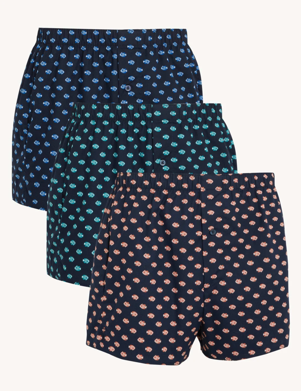 Refresh your underwear drawer with these pure cotton fish print boxers. Looser woven styles with functional button flys. StayNew™ technology maintains the colour and finish wash after wash.