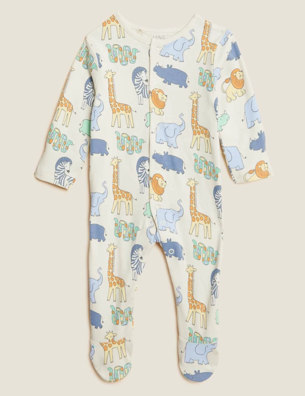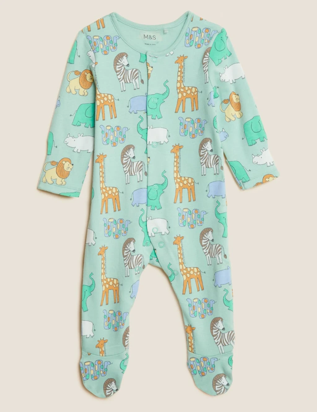 Get baby ready for naptime with these pure sleepsuits featuring adorable safari prints. Front popper fastenings for quick changing and a copper popper which allows you to easily match up the fastenings. Integral mitts on sizes up to 6 months protect from scratching. Babysafe toes and anti-slip detail on the feet provide extra protection and comfort. Flat seams feel soft on delicate skin. We only ever use responsibly sourced cotton for our clothes.