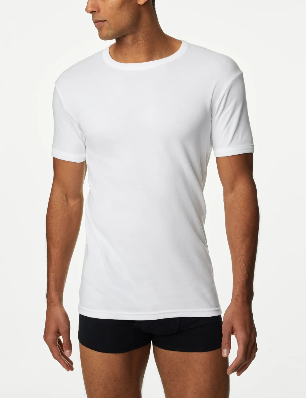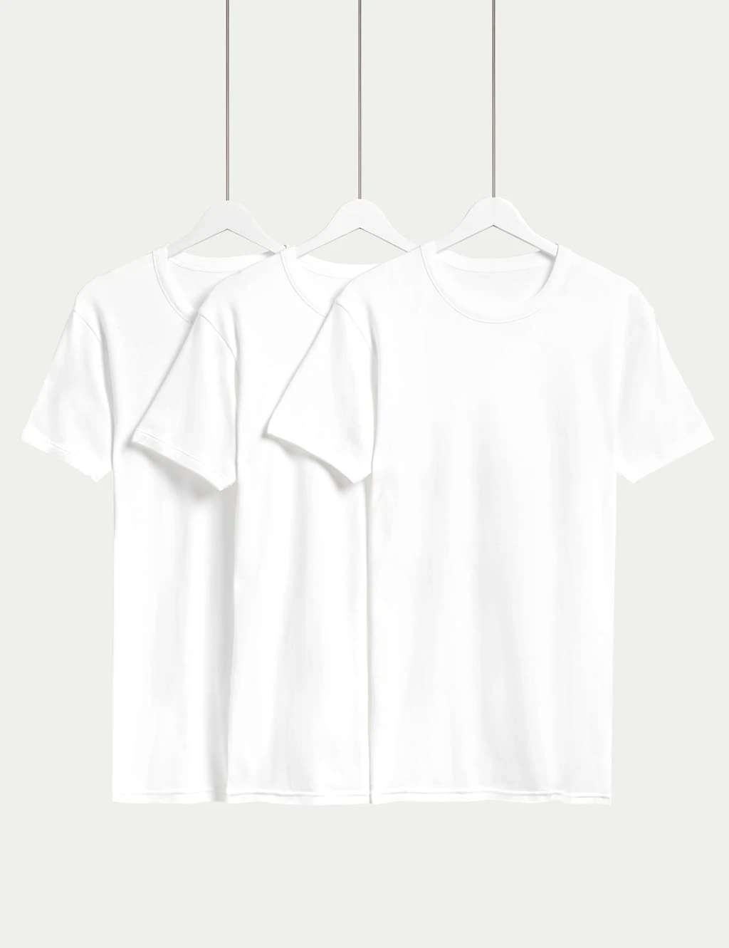 Add a cosy base layer to outfits with these pure cotton t-shirt vests. Pack of three, all designed in a regular fit with short sleeves. We only ever use responsibly sourced cotton for our clothes.