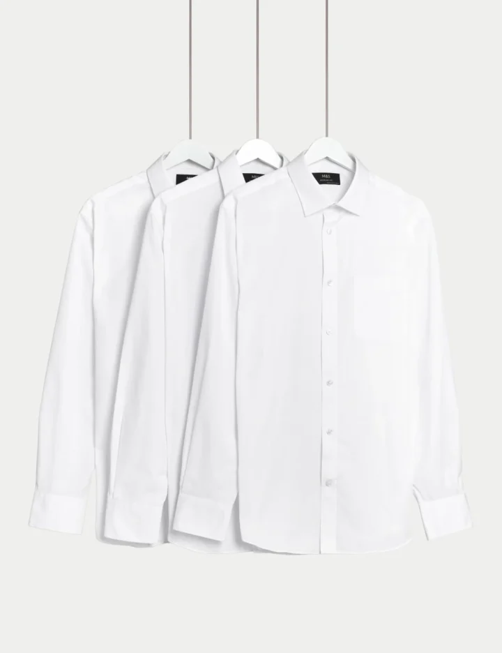 This pack of three smart shirts is the perfect foundation for your formalwear wardrobe. Cut from lightweight, crisp poplin to a classic regular fit. Easy-to-iron technology means they’re easy to care for. We only ever use responsibly sourced cotton for our clothes.
