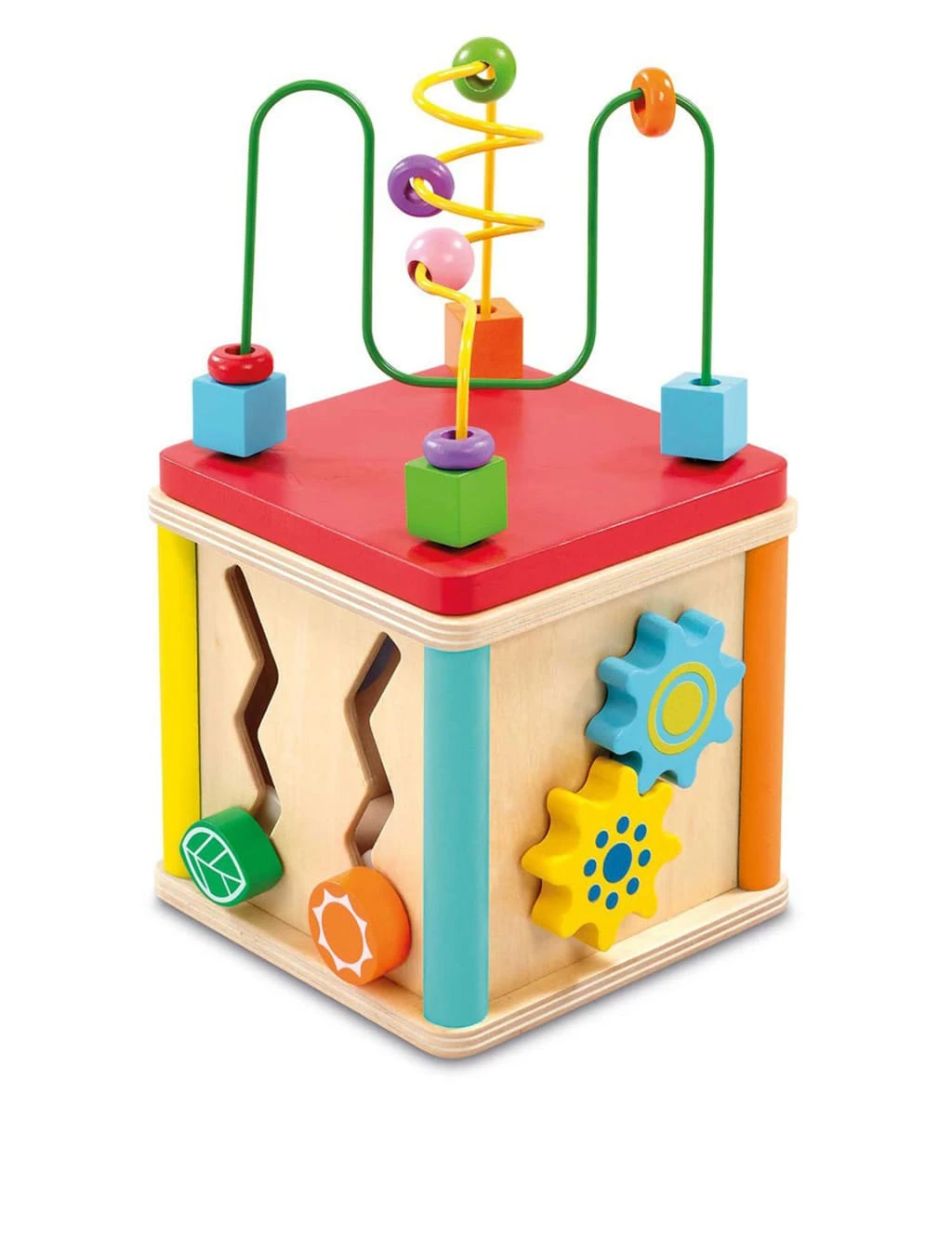 This Woodlets activity cube helps teach shape and colour recognition as well as encouraging problem solving and fine motor skills. Let them post the chunky shapes into the sorter, then turn the cogs to see them move together. They can also race the pegs along their tracks and thread the beads through the maze. As your youngster grows, they’ll love learning about time with the friendly clock face. When you’re ready to tidy up, the bead frame neatly folds away into the lid. Suitable for children 12+ months.