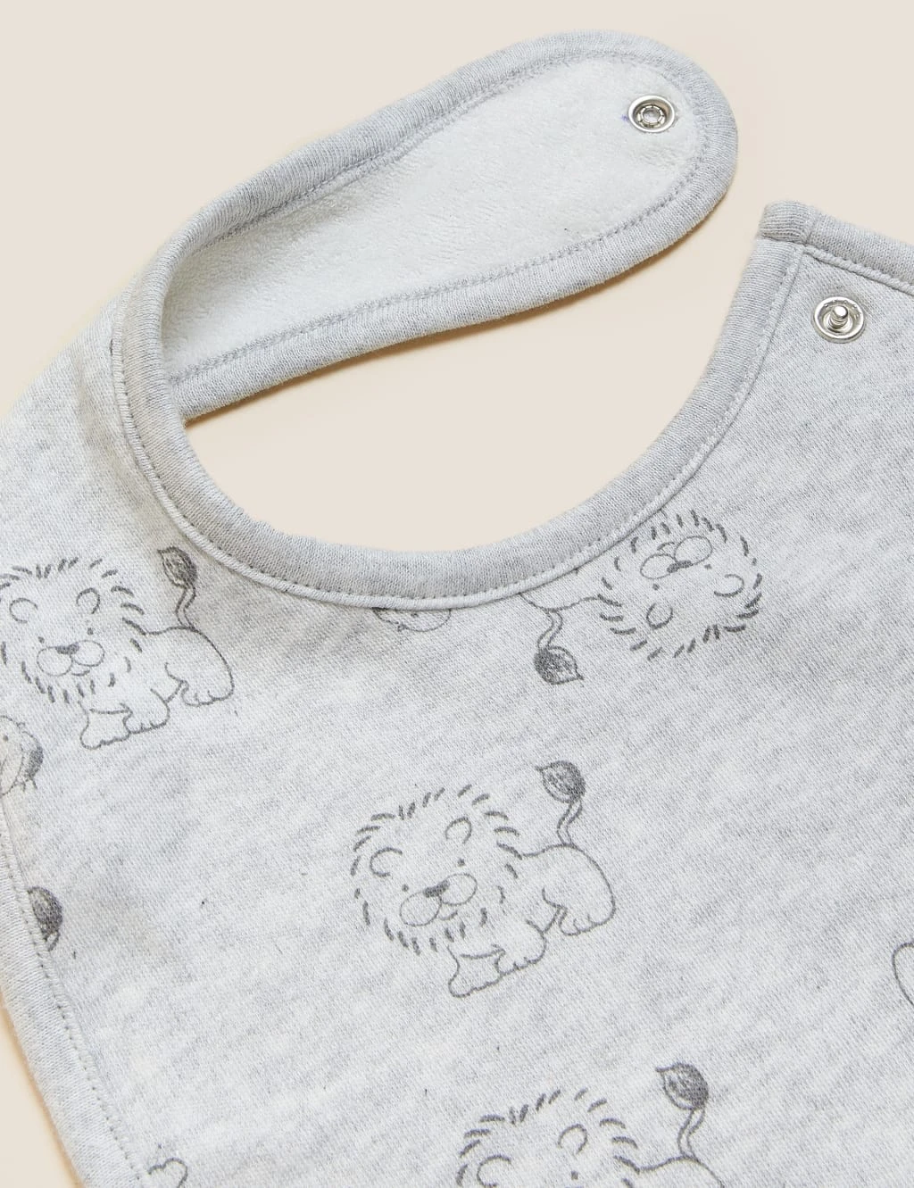 Catch the spills in adorable style with these printed cotton-rich dribble bibs. They’re designed in a classic round shape and feature absorbent towelling fabric at the back. Popper fastenings ensure easy on and off. Five-pack includes various designs, including lions, ducks and stripes. We only ever use responsibly sourced cotton for our clothes.
