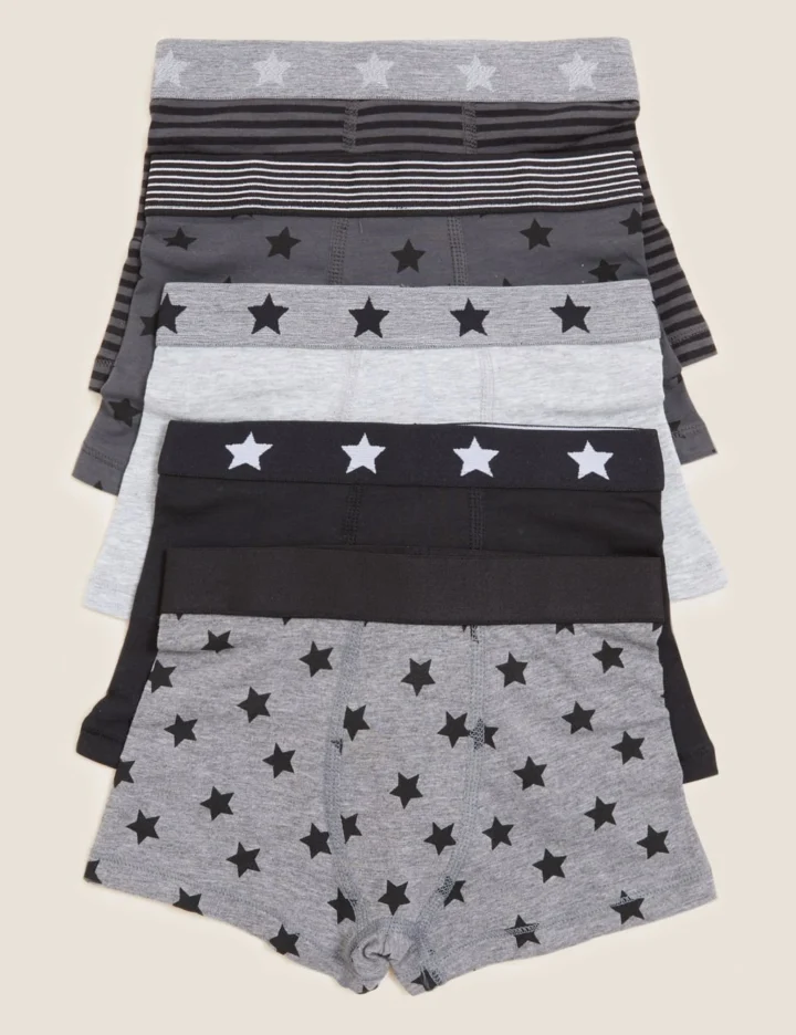 This pack of cotton-rich trunks will keep them comfortable wherever the day takes them. Pack of five includes one striped style, two plain designs and two with an all-over star print. Each pair has a contrast elasticated waistband for the perfect fit. Made with added stretch for easy movement. We only ever use responsibly sourced cotton for our clothes.