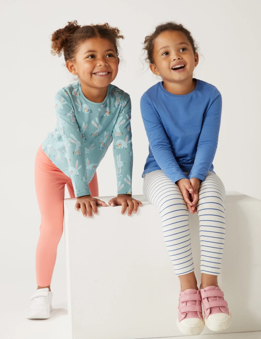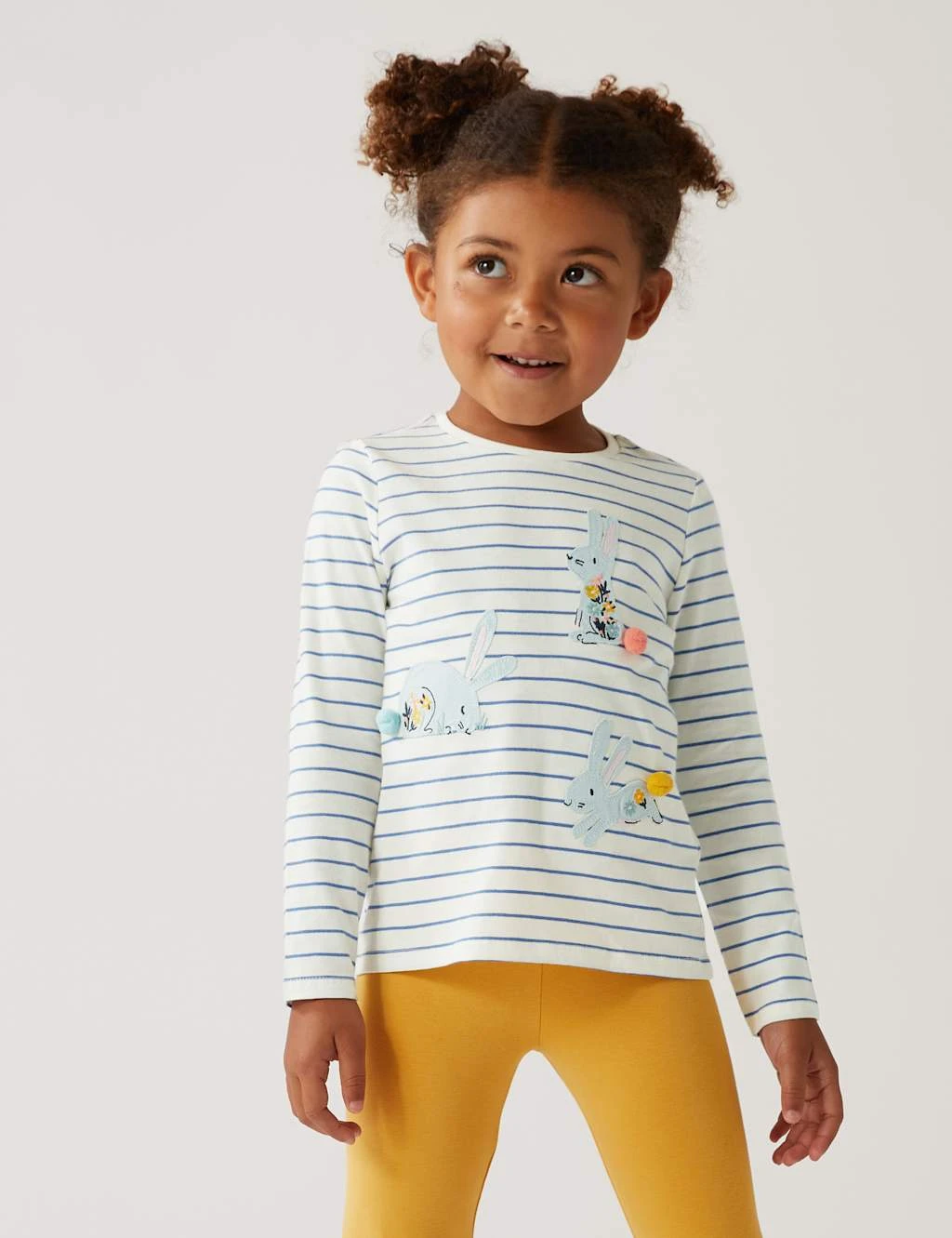 Getting them ready for the day is easy with this five-pack of pure cotton tops. Classic regular fit designs. Pack includes three plain tops, one with a cute all-over bunny print and one with stripes that features three bunnies with playful 3D tails. We only ever use responsibly sourced cotton for our clothes.