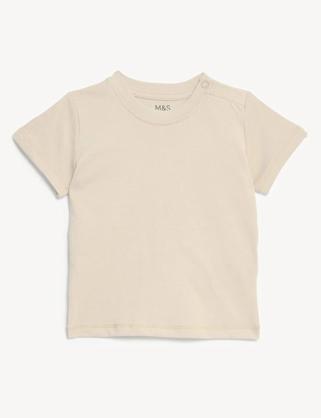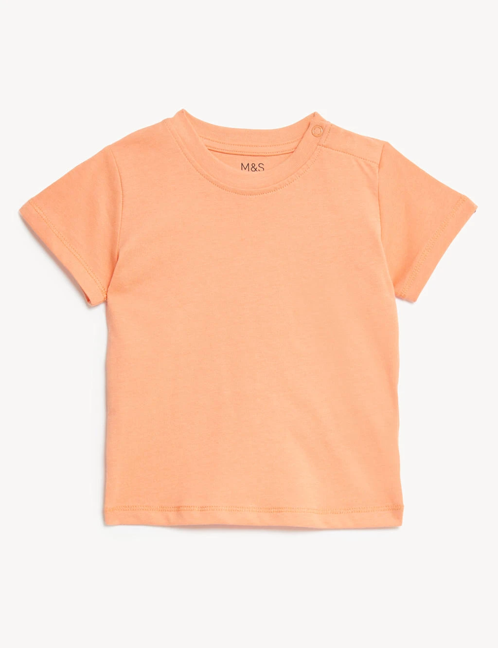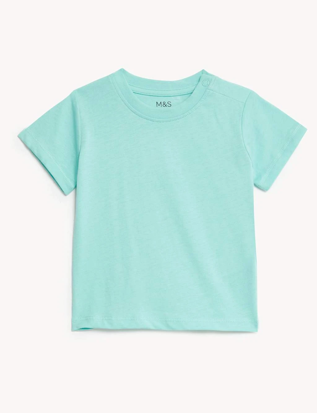 Stock up on their wardrobe essentials with these comfy pure cotton t-shirts. Designed with a round neckline and a popper fastening on the shoulder for easy dressing. Pack of five in assorted colours.