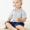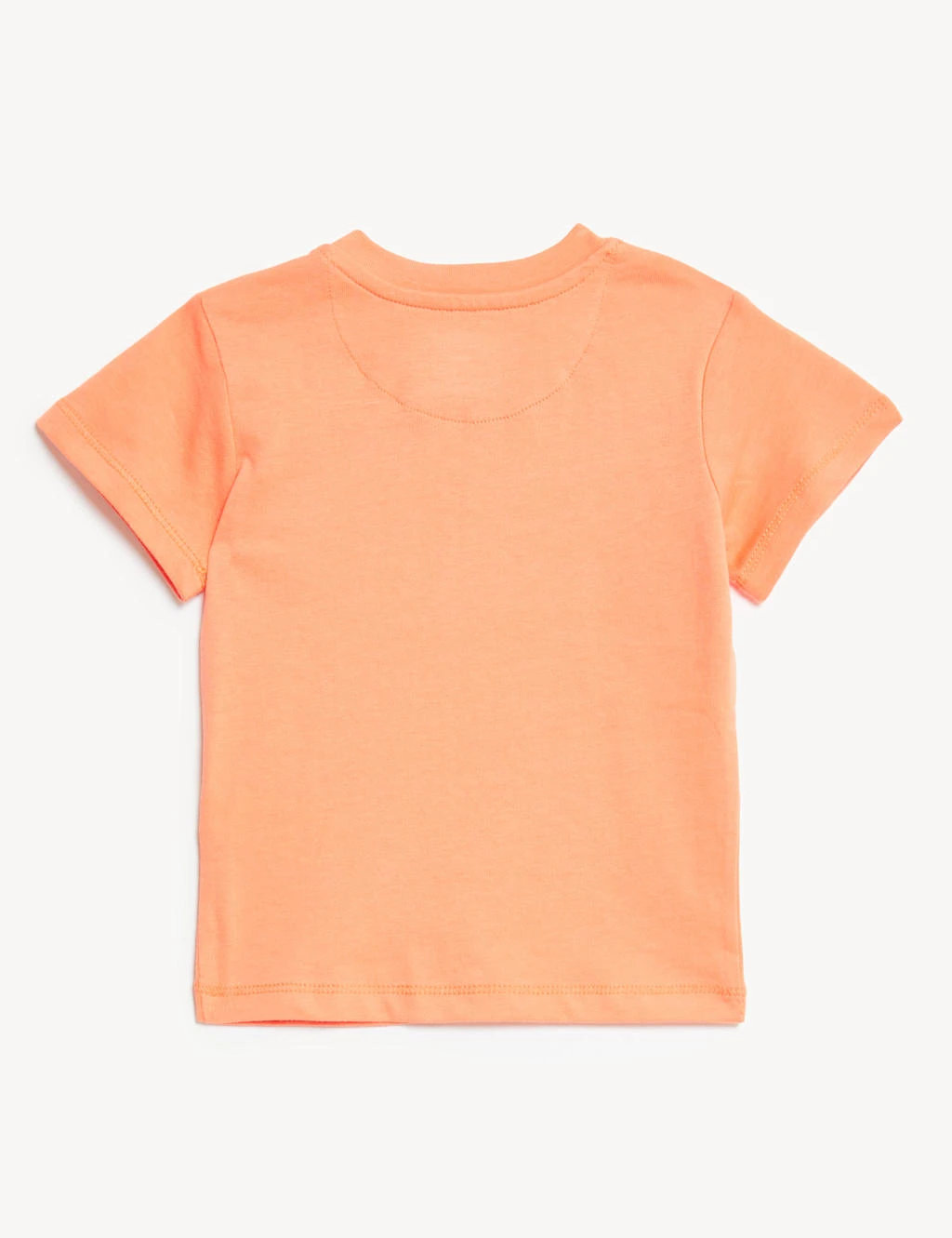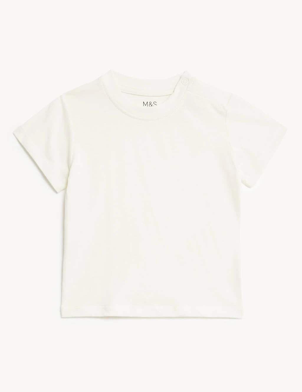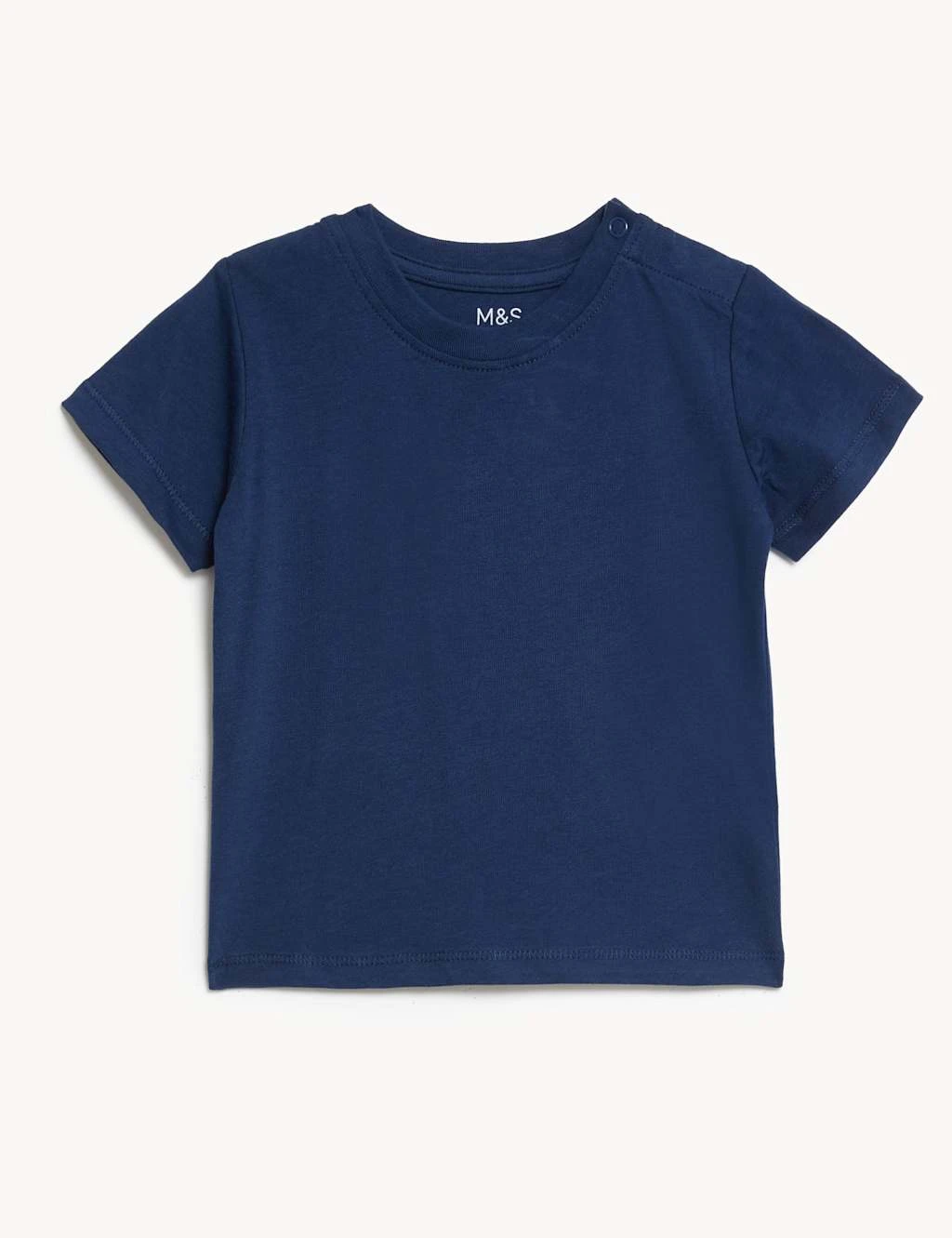 Stock up on their wardrobe essentials with these comfy pure cotton t-shirts. Designed with a round neckline and a popper fastening on the shoulder for easy dressing. Pack of five in assorted colours.
