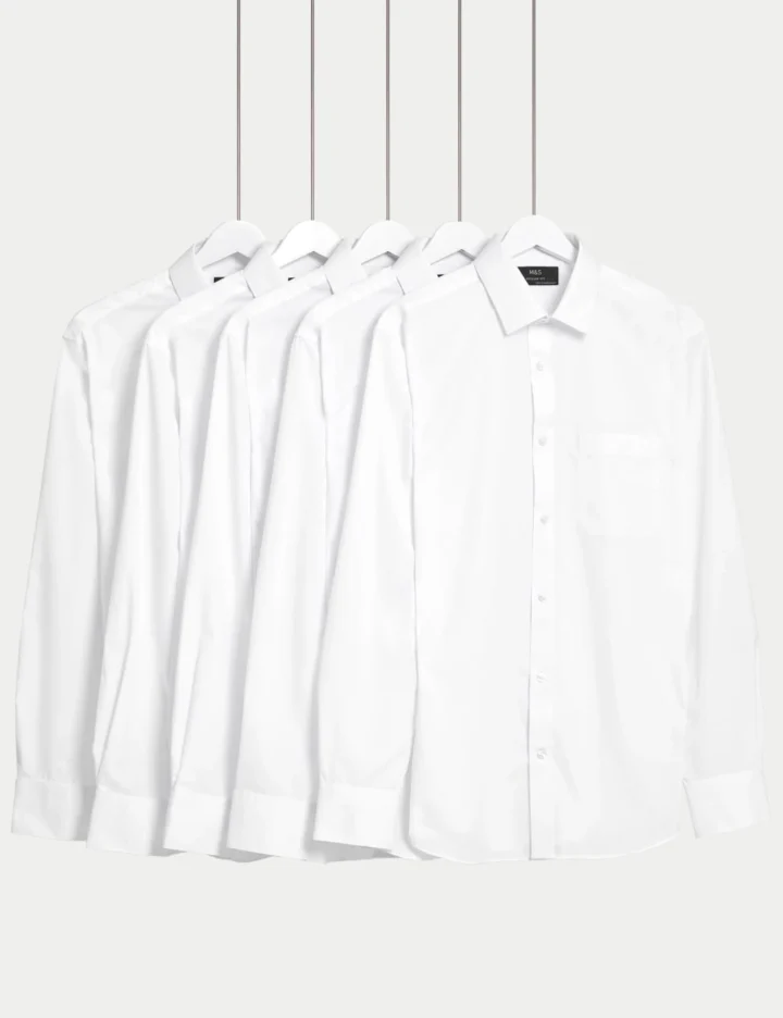 Feeling smart and crisp every day is simple with our five-pack of shirts. Regular fit provides plenty of room in the long sleeves and body, for a traditional wear. Classic collar with fixed collar-bones. Single-cuff fastening. Easy-to-iron finish makes light work of laundry. We only ever use responsibly sourced cotton for our clothes.