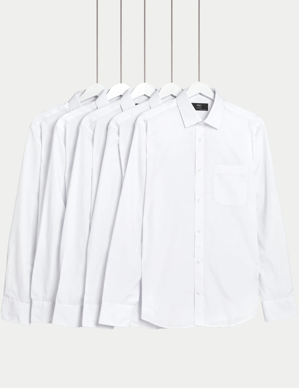Stock up on a wardrobe essential with our five-pack of long sleeve cotton-blend shirts. Slim fit hugs close to your body and arms for a sharp, modern outline. Classic collar with fixed bones and a single-cuff fastening. Easy-to-iron finish for quicker laundry. We only ever use responsibly sourced cotton for our clothes.