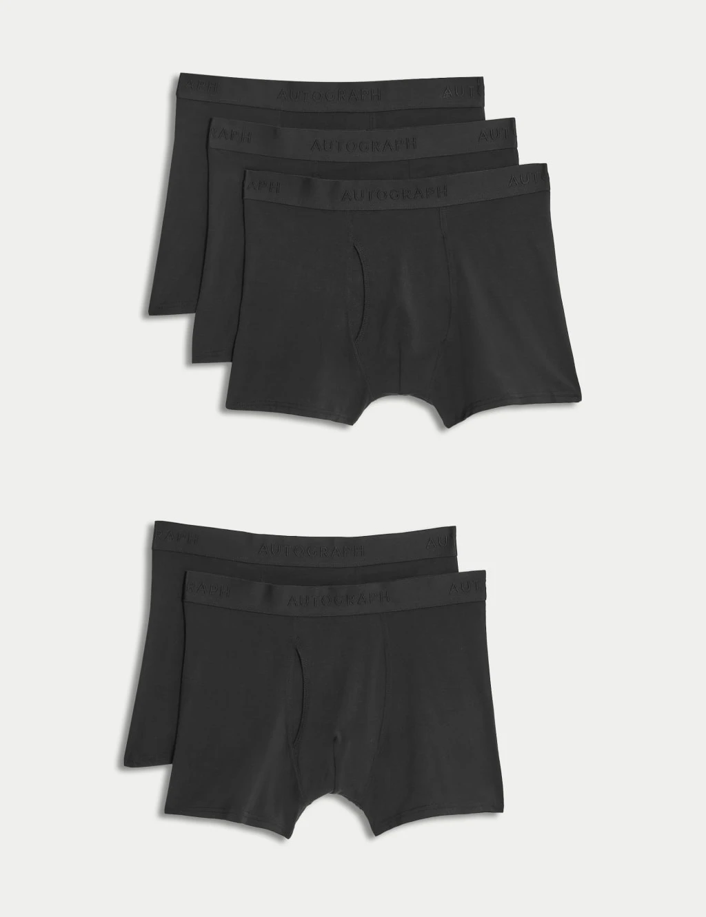 These five pairs of Autograph trunks are made from a Supima® cotton-modal blend, with 4-way stretch for all-day comfort. They’re cut to a regular fit, and feature a fly front fastening. A branded elasticated waist finishes the look. We only ever use responsibly sourced cotton for our clothes.