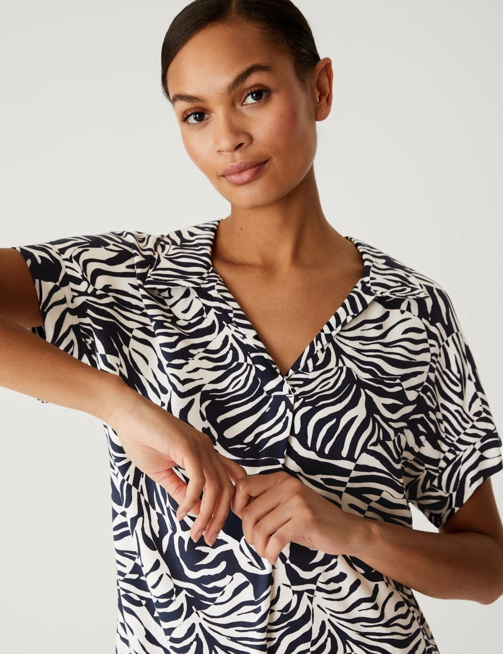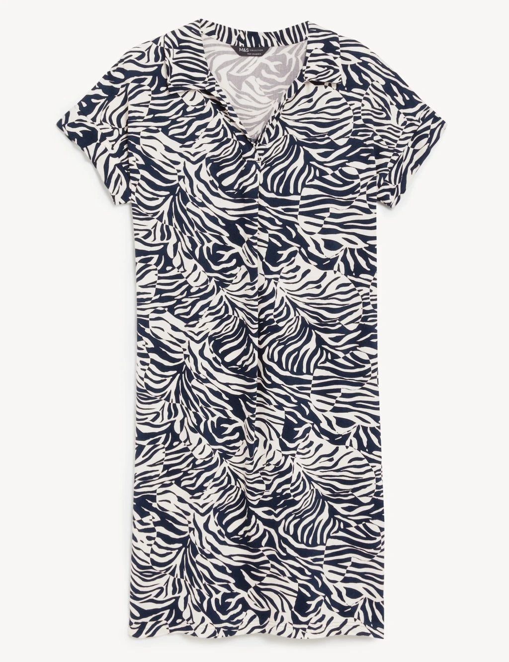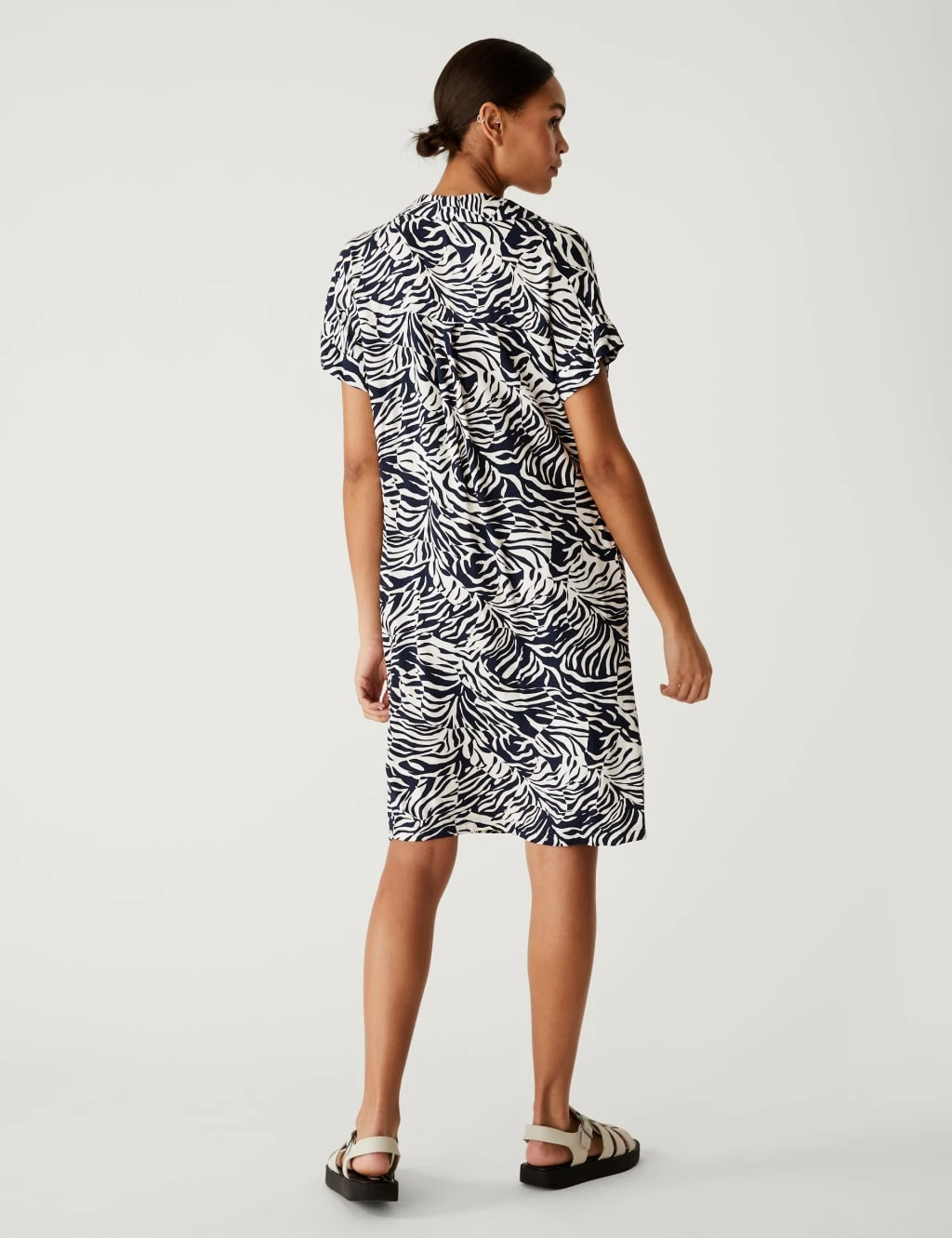 This animal print shift dress is designed to catch the eye. It’s crafted to a regular fit and features a flattering v-neckline with a neat collar. The short sleeves are complete with folded hems for added style, while the knee-length hem adds a modern touch.