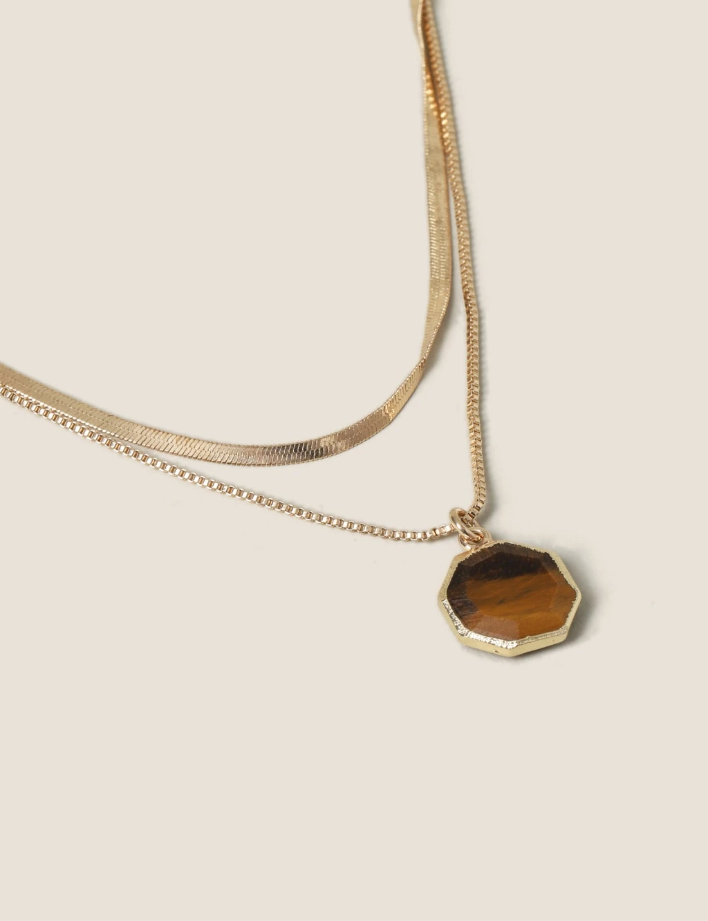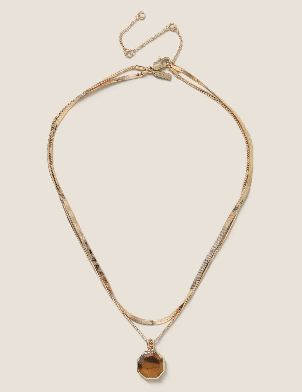 This Autograph gold tone double row chain with semi precious tiger eye stone on the longer gold chain