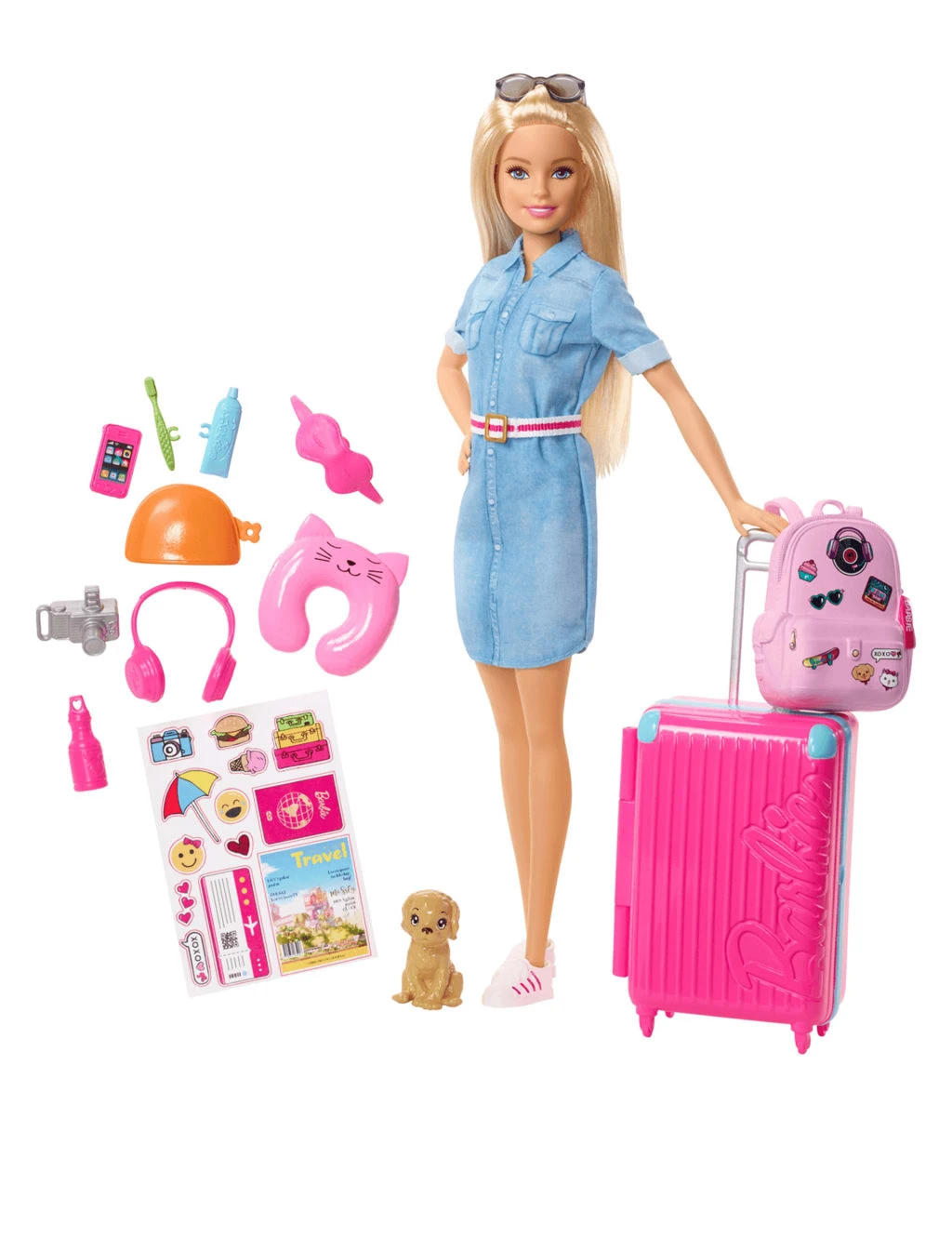 Barbie’s all set to head off on holiday in this fun travel playset. Denim-clad Barbie has everything ready to pack with her pillow and headphones to hand for a comfy trip. Children can enjoy imaginative play by decorating her suitcase with stickers, then packing it for her journey. The doll comes complete with an adorable puppy along with a backpack and essential travel accessories like a toothbrush, toothpaste, camera, eye mask, purse and phone. Suitable for children from 3 years.