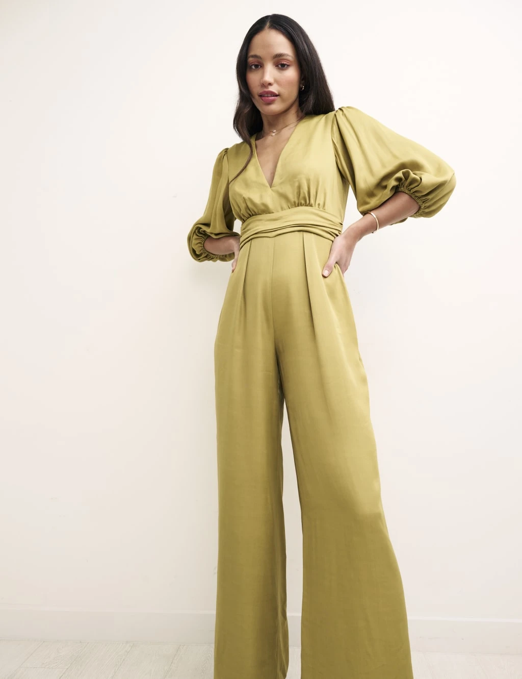 Subtly lustrous fabric lends a luxurious air to this Nobody’s Child jumpsuit. It nips you in at the waist with a ruched band, before falling away into drapey wide-leg trousers. Mid-length puffed sleeves add statement-making volume to the silhouette. The piece is complete with a deep v-neckline and an elegant cutout panel at the back.