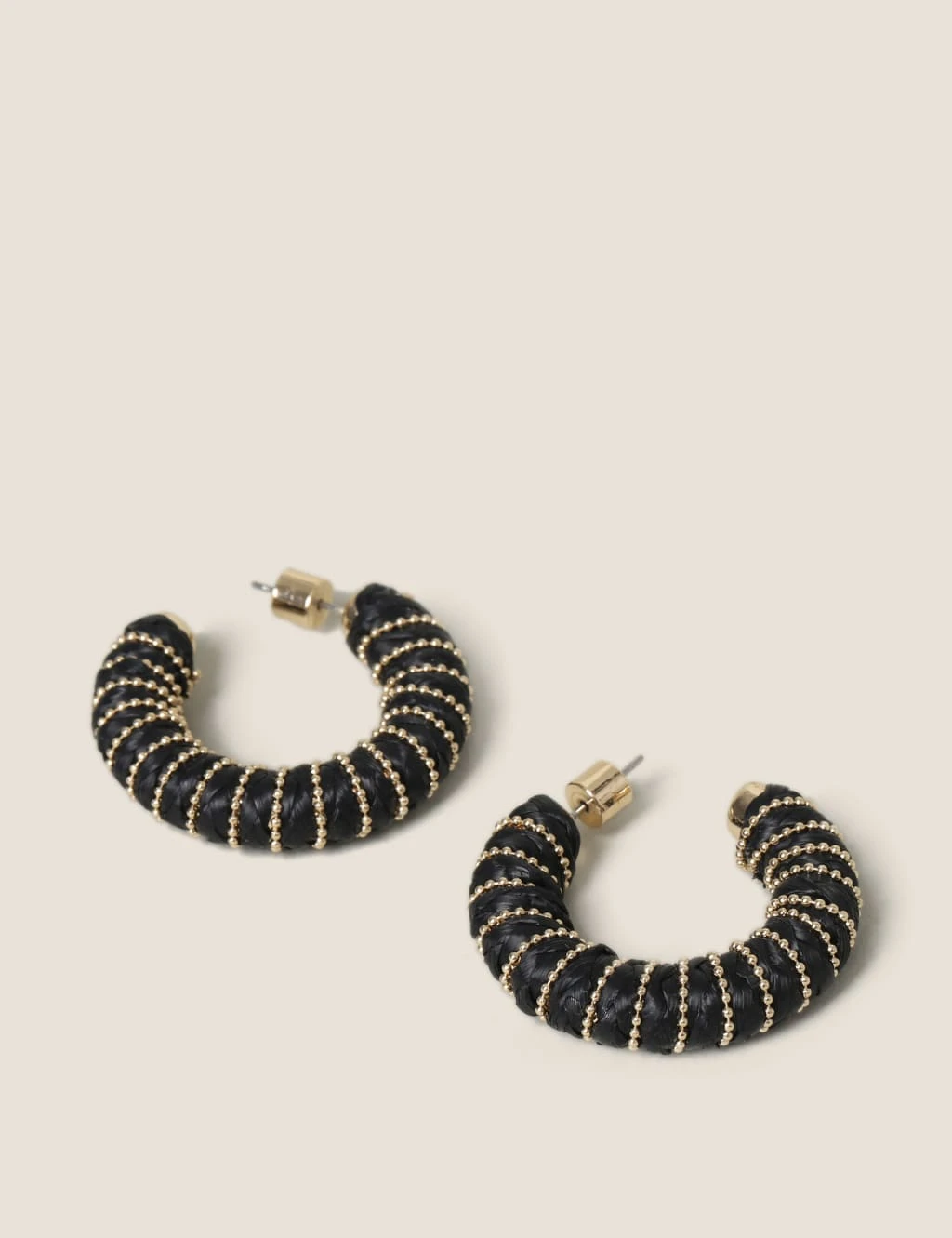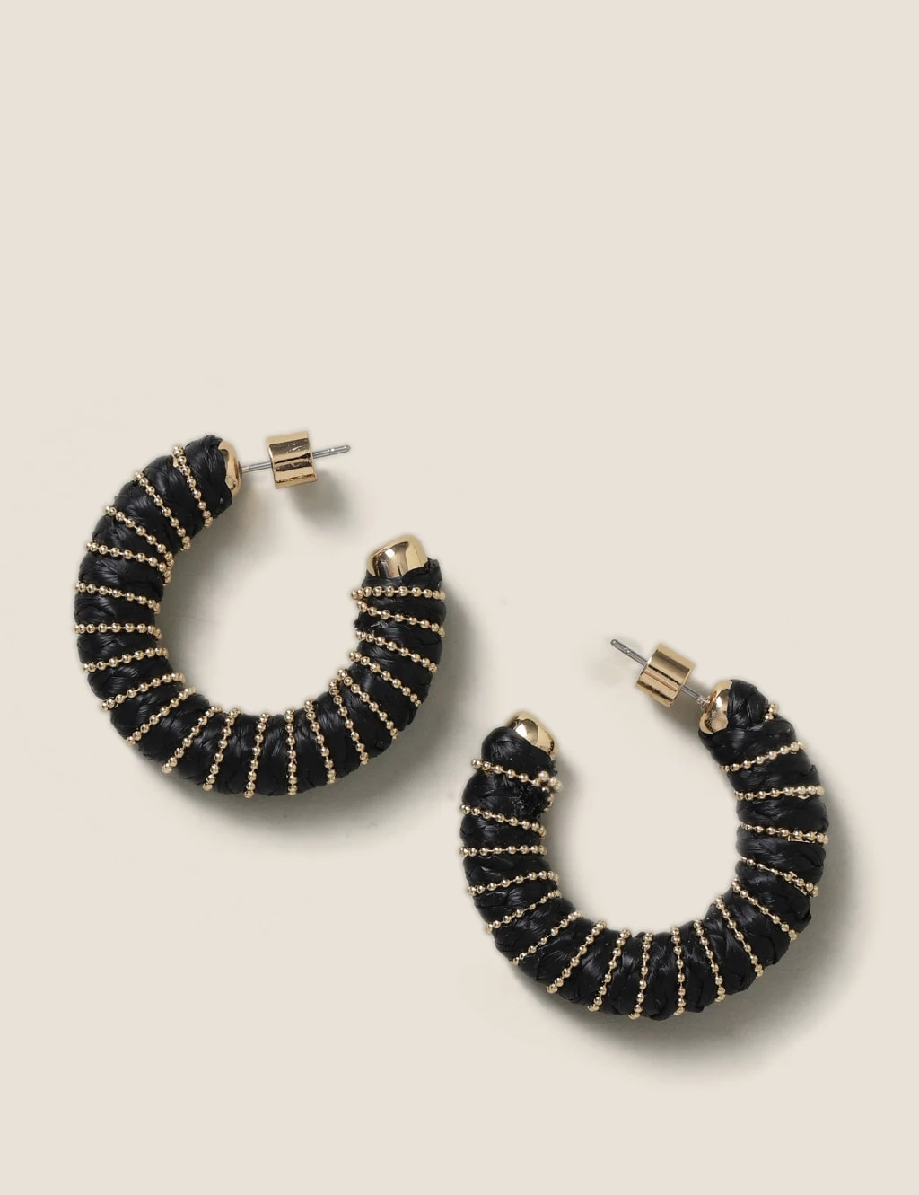 These Large Black Raffia material hoop are wrapped around a gold base hoop, with the gold detailing shining through to add something extra to your outfit