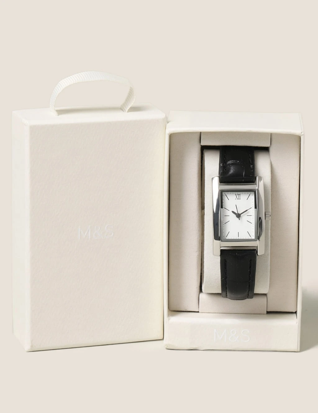 Add to any outfit with this timeless silver toned quare face watch with black etched hour hands with an elegant black faux leather croc print strap