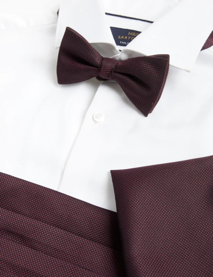 Complete your black tie outfit in style with this bow tie, pocket square and cummerbund set. Fabric has a smart textured finish.