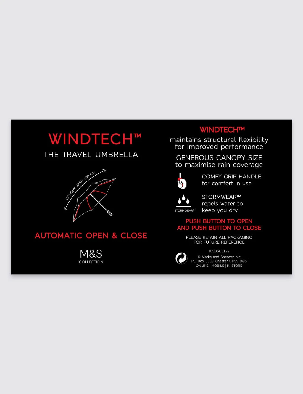 Small enough to fit into your briefcase, be prepared with protection against the elements when out and about with our stylish compact umbrella. Combining our weather resistant Stormwear™ and Windtech™ technologies as well as a comfy grip handle, this briefcase umbrella is an essential for those rainy days.